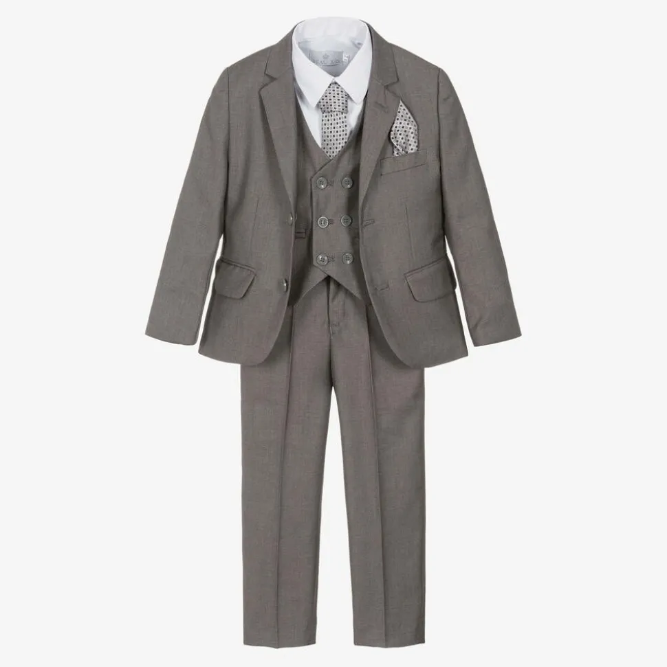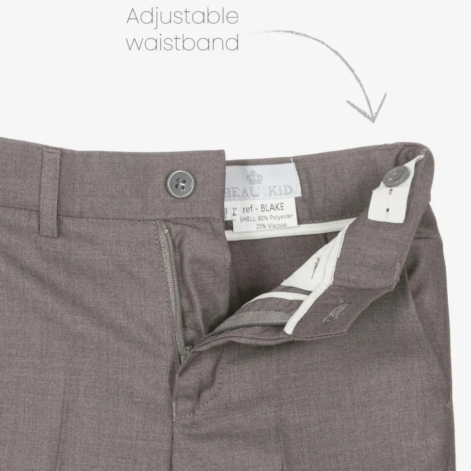Grey suit for boys by Beau KiD, made in a soft viscose blend with a silky satin lining. With an additional inside pocket, the single-breasted jacket has two flap pockets and a decorative buttonhole on the lapel to give the suit a more formal look. The matching trousers, fitted with an adjustable waist, are designed with belt loops and side pockets. To look extra smart, the suit can be worn with a matching waistcoat and a patterned tie that neatly complements the pocket square. Woven with a subtle tonal pattern, the white shirt completes this occasion look.