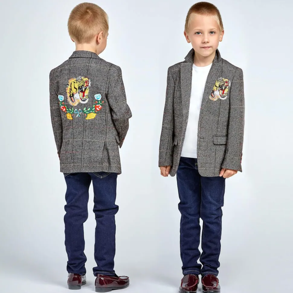 From Romano's luxury collection, this boys blazer is both smart and stylish. In grey tweed with a fine check pattern, it has eye-catching tiger embroidery designs on the front and back. It has a double vent for ease of movement, with front and internal pockets, and a beautiful silky lining.