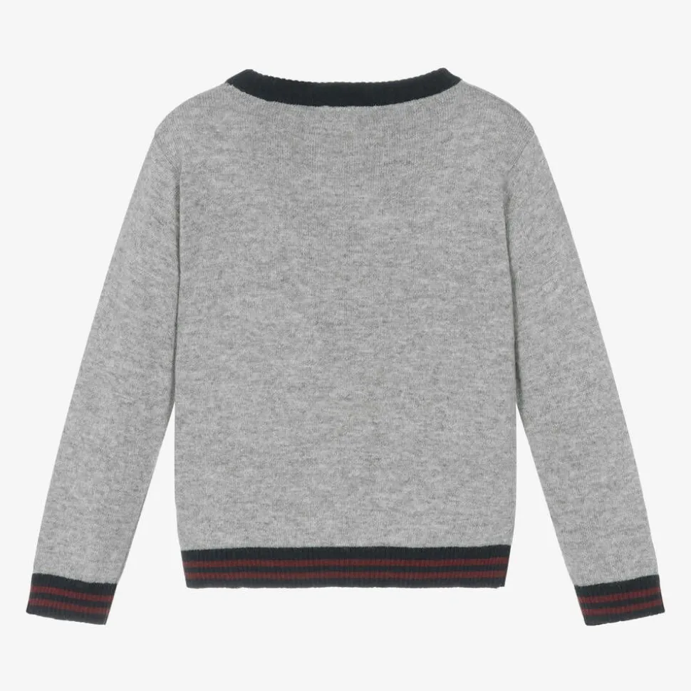 Grey sweater for boys by Patachou, knitted in a blend of luxuriously soft viscose and extra fine Merino wool, with a hint of cashmere. There is an adorable teddy bear logo motif on the front, wearing a winter hat with navy blue and burgundy red stripes to match the sweater's ribbed cuffs and hem. Smaller sizes have buttons on one shoulder to help with dressing.