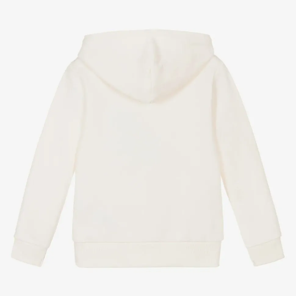Casual ivory cotton hoodie for boys by American brand Tommy Hilfiger, made in soft, comfortable jersey, ideal for relaxed days. It has a useful pouch pocket on the front, neat ribbed trims, and the designer's iconic flag logo embroidered in red, white and blue on the chest and one cuff. Coordinating logo tape can be seen on the inside of the neck. This sweatshirt is made with at least 50% organic cotton.