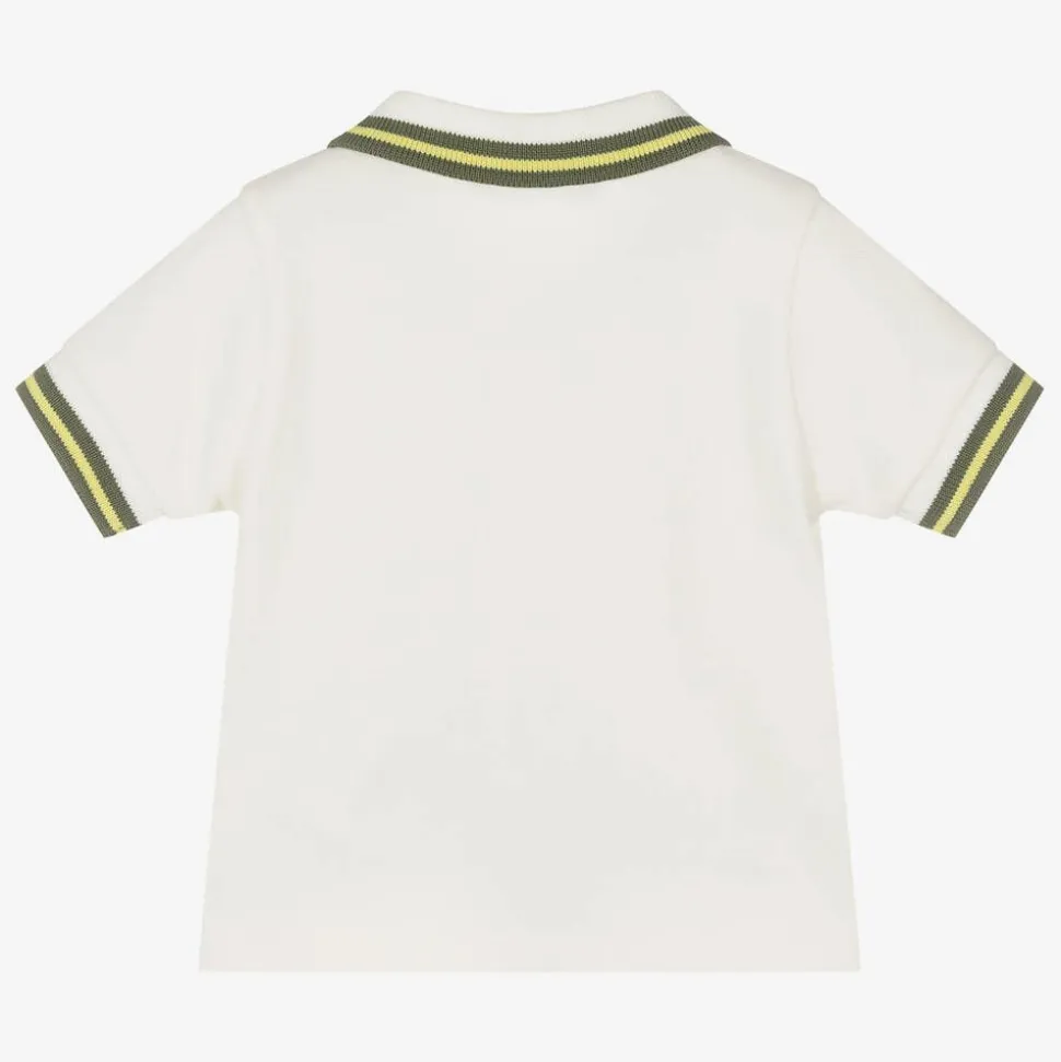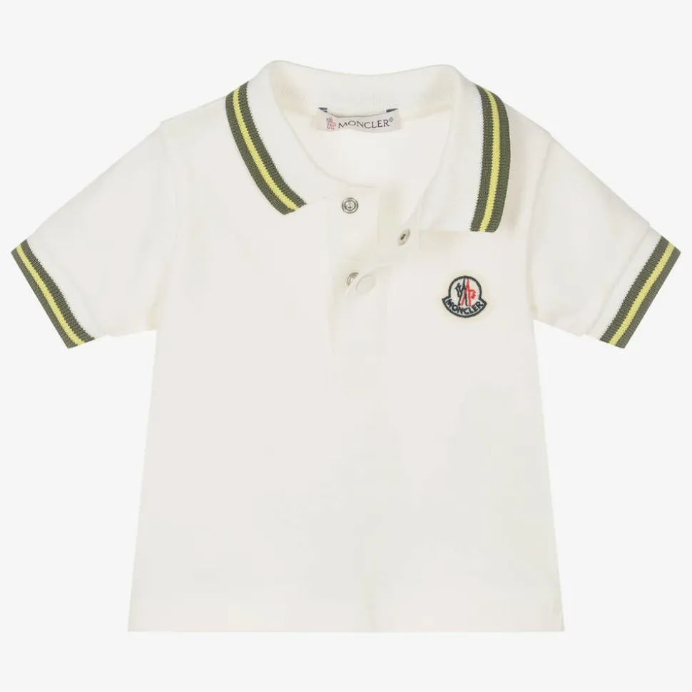 Ivory short-sleeved polo shirt for little boys by luxury brand Moncler Enfant, made in soft and stretchy cotton piqué. Symbolic of the brand, it has a felt logo patch on the chest and branded poppers on the placket. The ribbed collar and cuffs are trimmed with sporty green stripes in two contrasting shades.