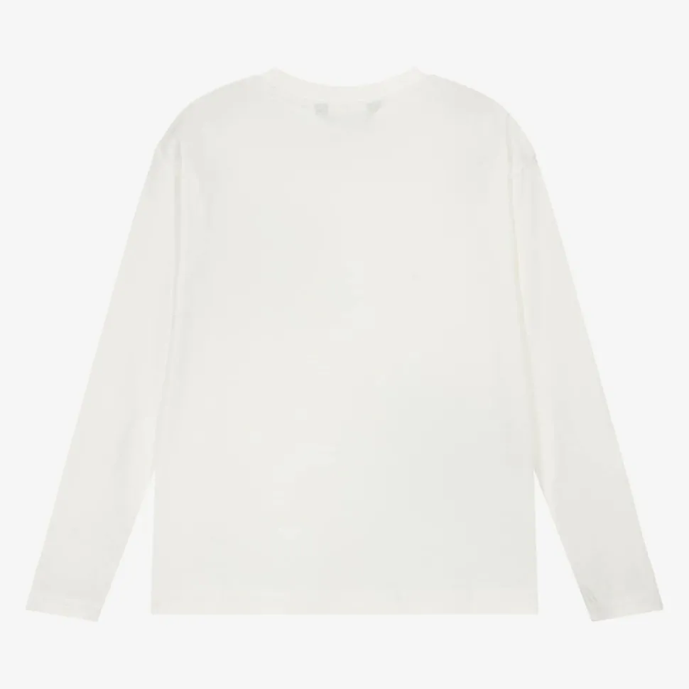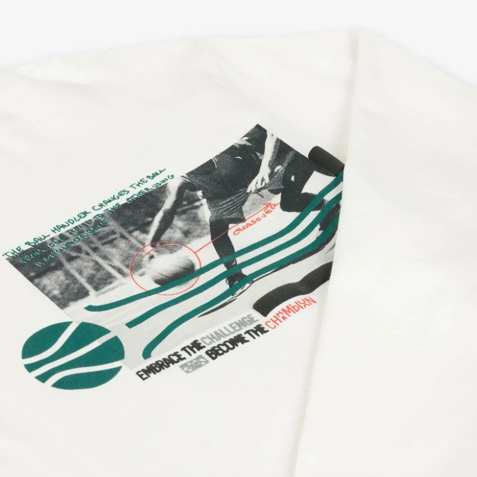 Ivory top for older boys by Mayoral Nukutavake, made in comfortable cotton jersey. It is printed with cool basketball graphics on the front in green and black.