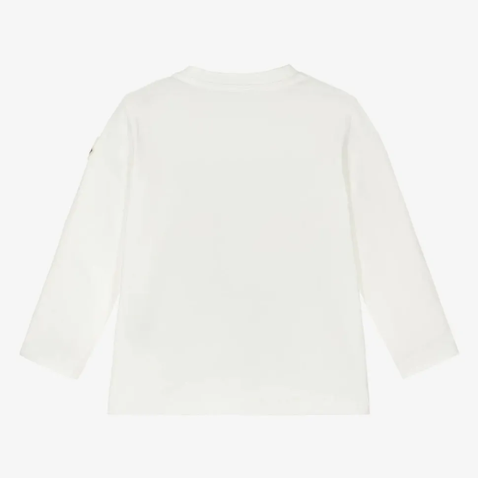 Ivory cotton top for little boys by luxury brand Moncler Enfant. The iconic felted logo patch is stitched on one sleeve, and the signature motif is printed on the front in a bold tricolour design. It is made in soft and stretchy jersey with shoulder popper fastenings to help with over-the-head dressing.