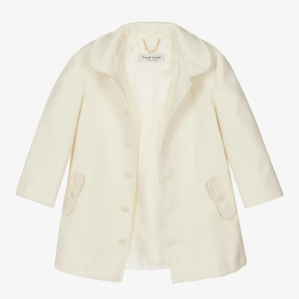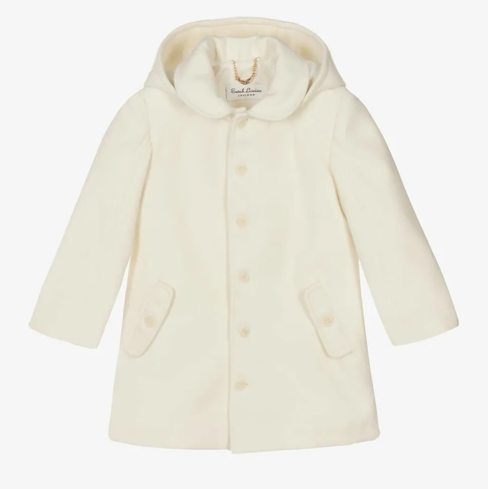 Ivory coat for little boys by British designer Sarah Louise. This traditional design is made in a beautifully soft, brushed viscose blend with smart marbled front button fastenings, a silky-soft lining, and button-closing side pockets. Versatile and classically styled, the hood is removable, attaching with buttons.