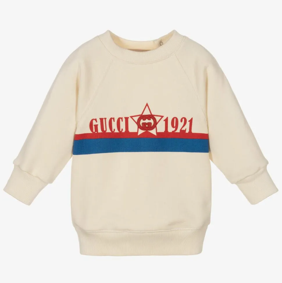 Ivory sweatshirt for little boys by luxury Italian designer Gucci. Symbolic of the brand's founding year, the front has a Gucci 1921 star print in red and blue, with the signature Interlocking G logo patch. Comfortably oversized, it is made in soft cotton jersey and has ribbed trims, raglan sleeves, and back popper fastenings for easy dressing.