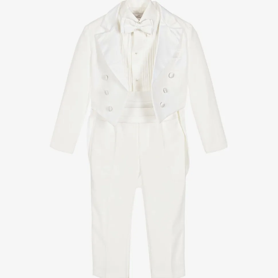 Boys ivory tuxedo suit by Beau KiD. The tail jacket and trousers are made in a lightweight twill, with satin trim to match the cummerbund and bow tie. The jacket is designed not to fasten and the trousers have an elasticated waist. It comes with an ivory cotton blend dress shirt. The fit can be quite big, so we recommend you check measurements before ordering.