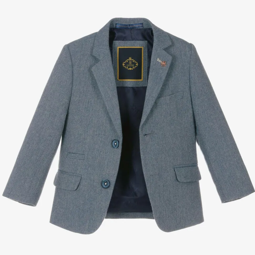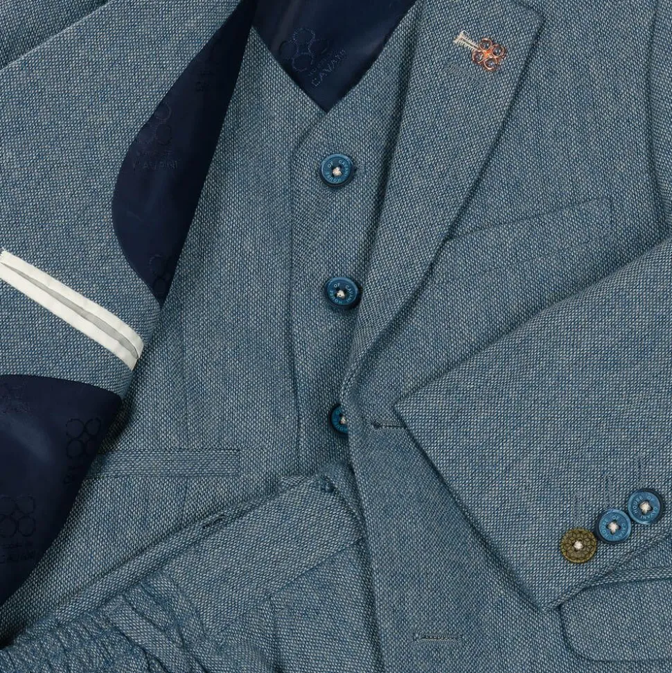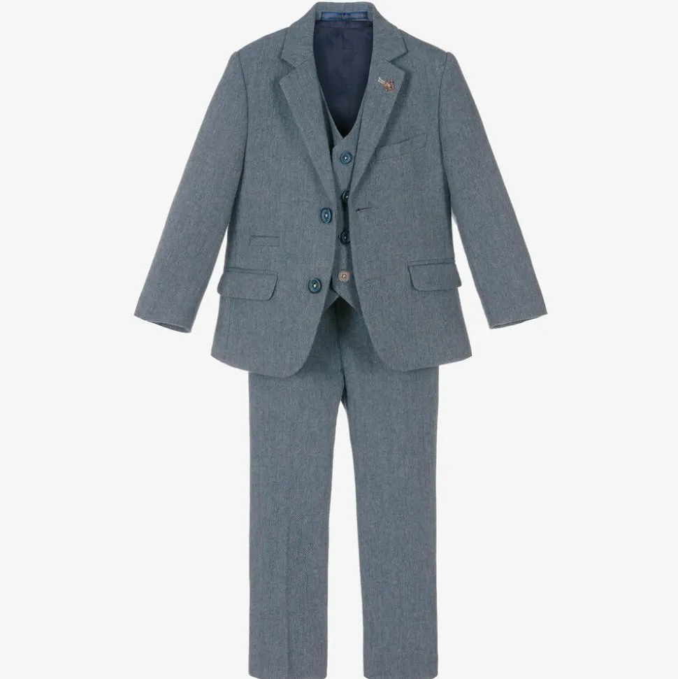 Three-piece light blue Mini-me suit for boys by House of Cavani, made in a wool blend tweed and beautifully tailored for special occasions. The single breasted jacket has classic styling and a removable rose gold coloured logo pin on the buttonhole. Both the jacket and waistcoat are lined for comfort and have matching accent buttons. The trousers are styled with slanted pockets, buttoned back pockets and a part elasticated waist for a good fit.