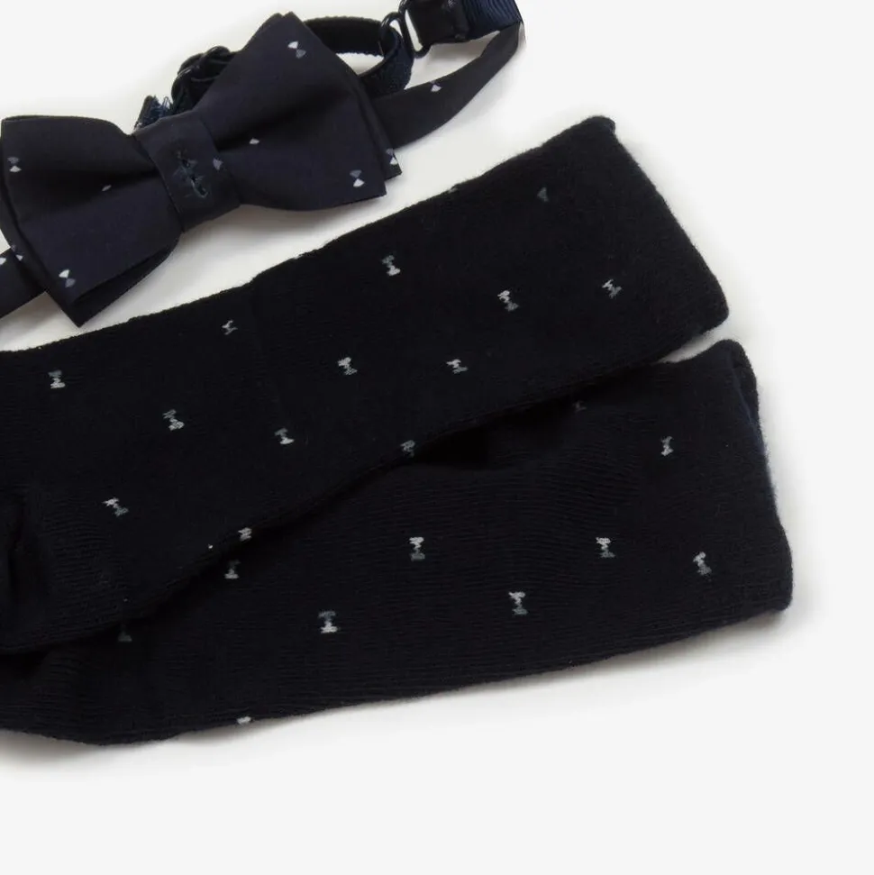 Navy blue bow tie and socks set for boys by Mayoral, ideal for adding a coordinating touch to any outfit. The bow tie is made in smooth satin and is patterned with tiny white and grey bows. It has an elasticated, adjustable strap which fastens with velcro for comfortable wear. The cotton-rich ankle socks have a tiny white and grey 'M' pattern and softly ribbed cuffs.