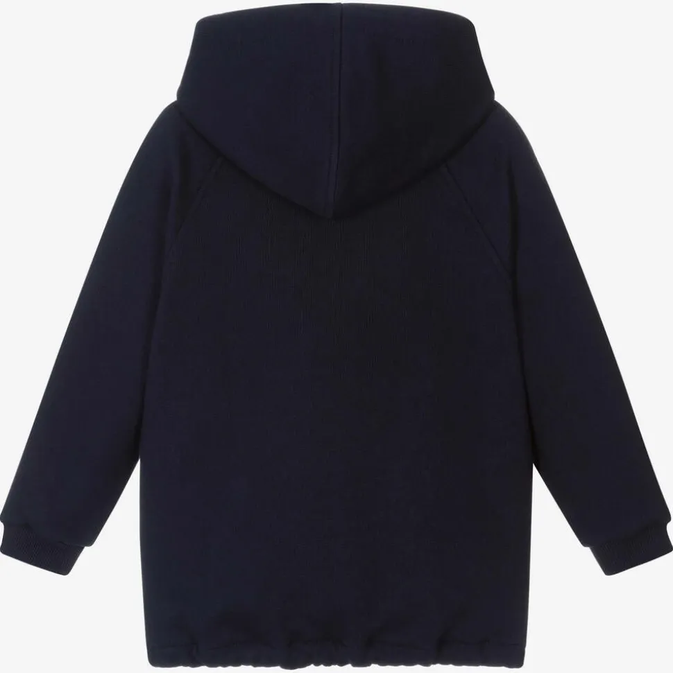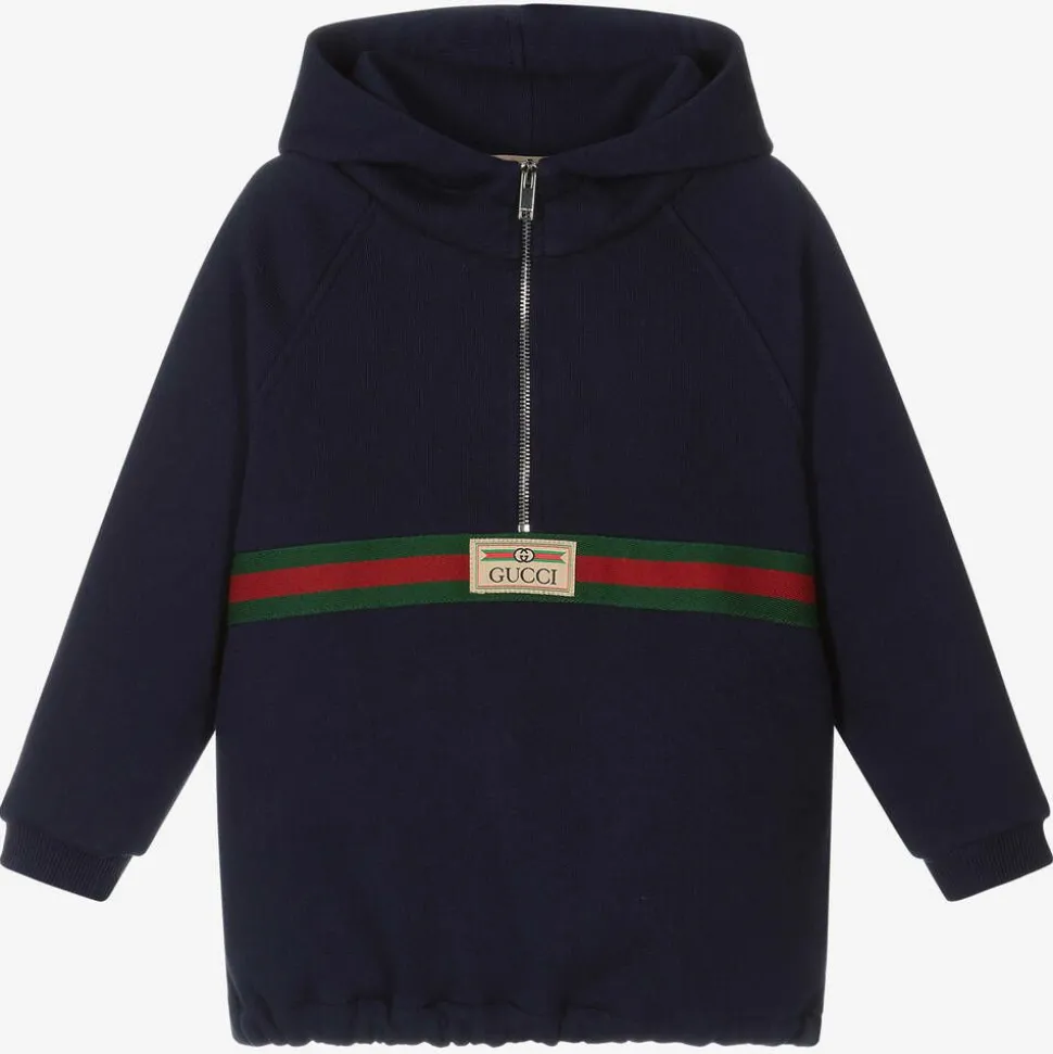 Elevate your little boy's essentials with this navy blue cotton hoodie by luxury Italian brand Gucci. It has the brand's iconic red and green Web trim across the chest with an ivory Gucci vintage logo patch. It has a half zip fastening and an elasticated hem for a laid-back style.