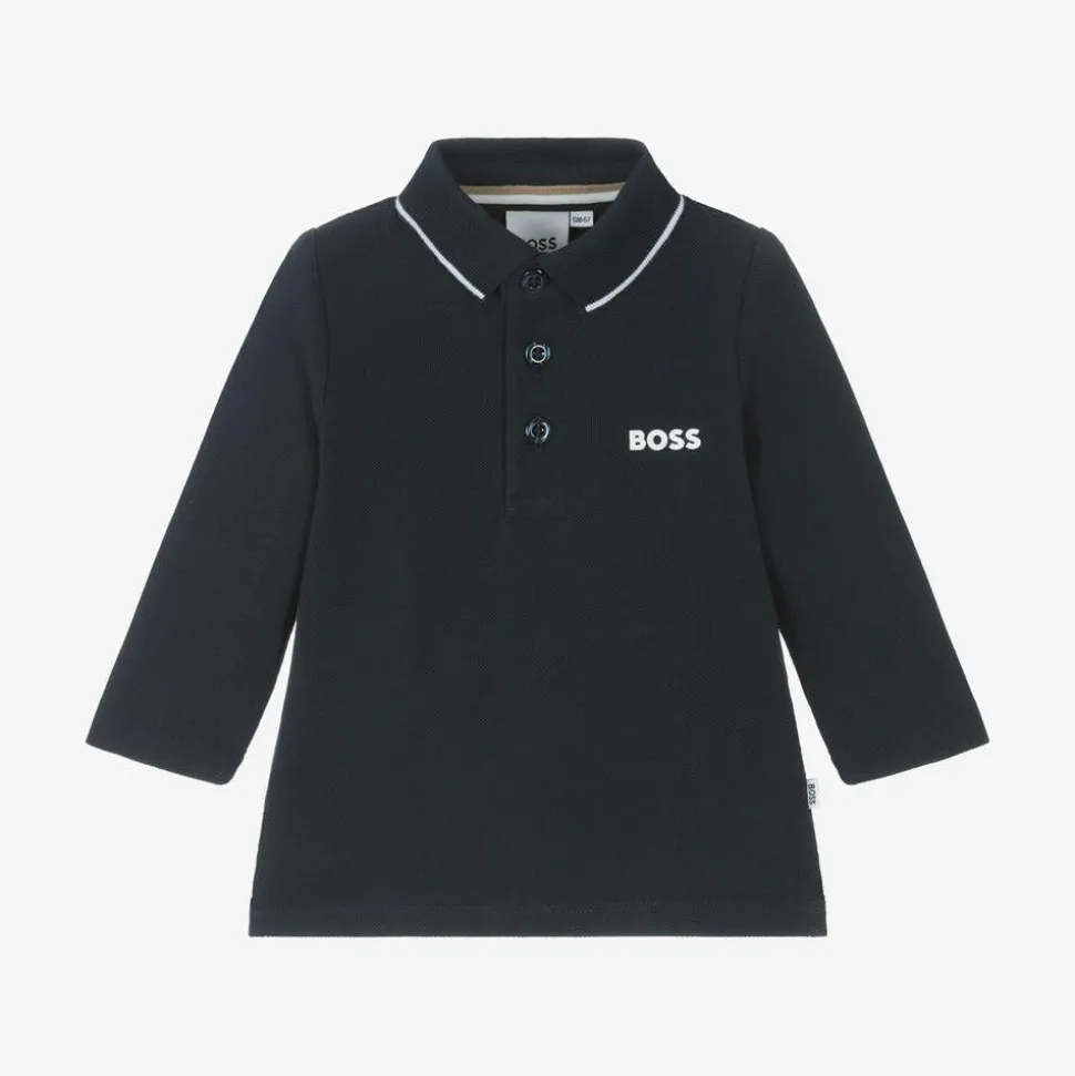 Navy blue long-sleeved polo shirt for little boys by BOSS, made in soft and comfortable cotton piqué. It has a classic ribbed collar with white trim, branded button fastenings and a split hem for ease of movement. Adding a distinctive designer touch, there is a rubberised white logo on the chest and a branded tab on the side seam.