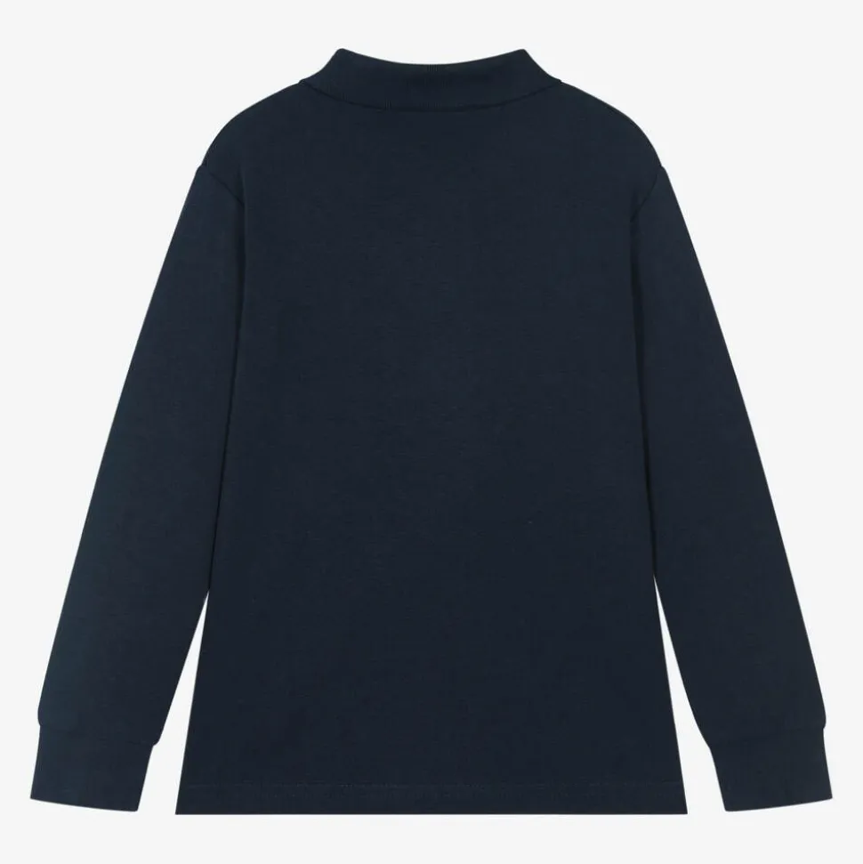 Casual navy blue rugby shirt for boys by Italian brand iDO Baby, made in soft cotton jersey. This wardrobe staple has ribbed cuffs on the long sleeves and a hemline that is longer around the back than the front. A tonal slogan on the chest and branded button fastenings on the front add a subtle designer finish.