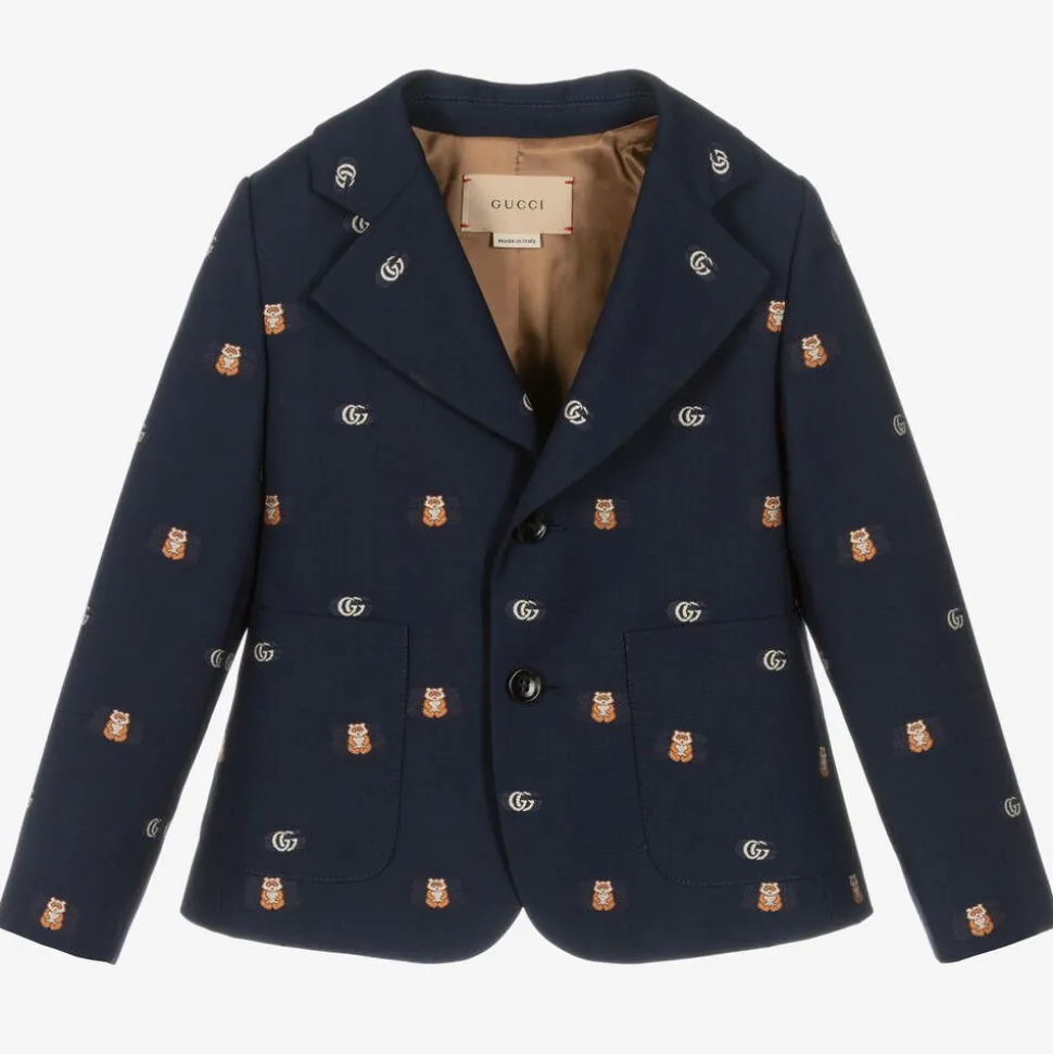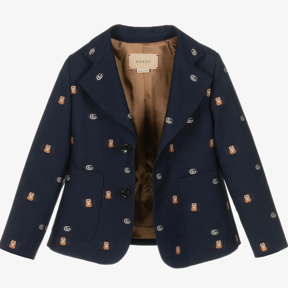 A smart navy blue blazer for boys by luxury Italian brand, Gucci. Beautifully constructed from a wool and cotton blend weave, it has an intricate fil coupĂ© design featuring the House's iconic Double G logo and red panda motif. Fastening with branded buttons on the front, it has a classic notched lapel, useful patch pockets, and a soft silky lining.