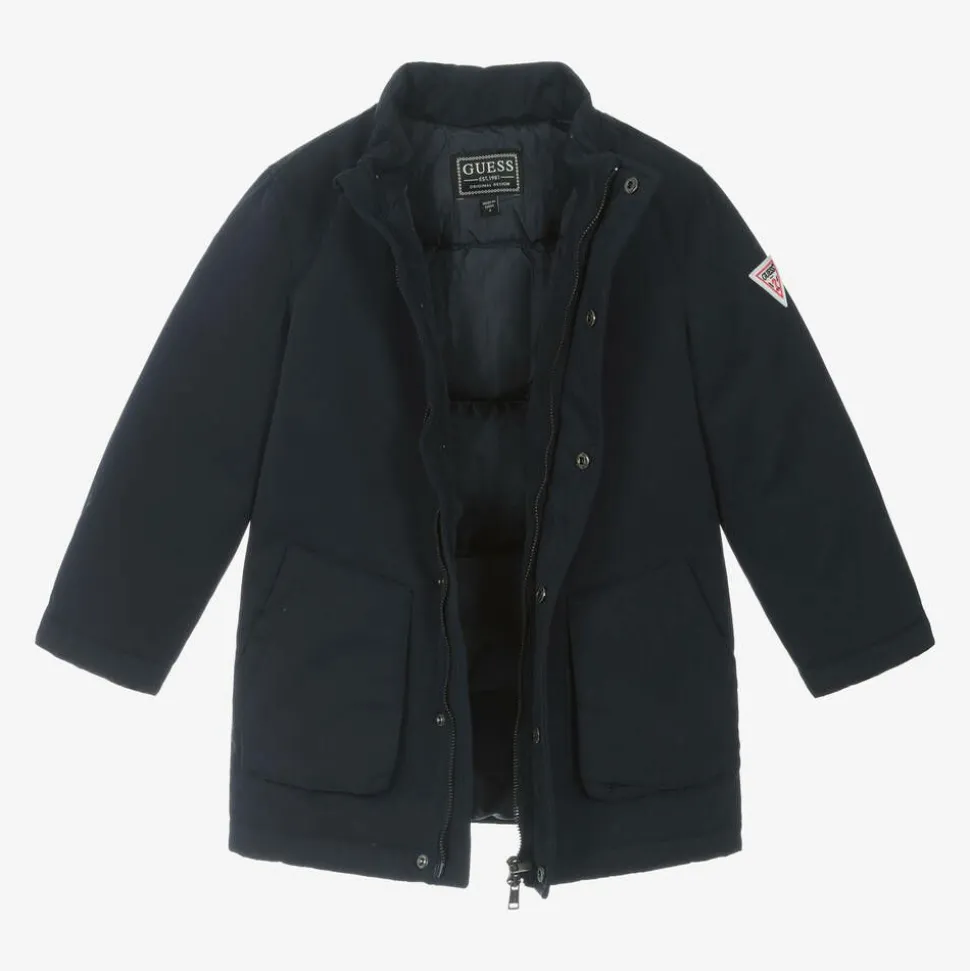 From Guess for younger boys, a classic navy blue parka coat with a beige faux fur trimmed hood. This lovely coat is down-filled and has a storm flap over the zip fastening to keep warmth in and the elements out. Both the hood and the faux fur trim are detachable for alternative looks.