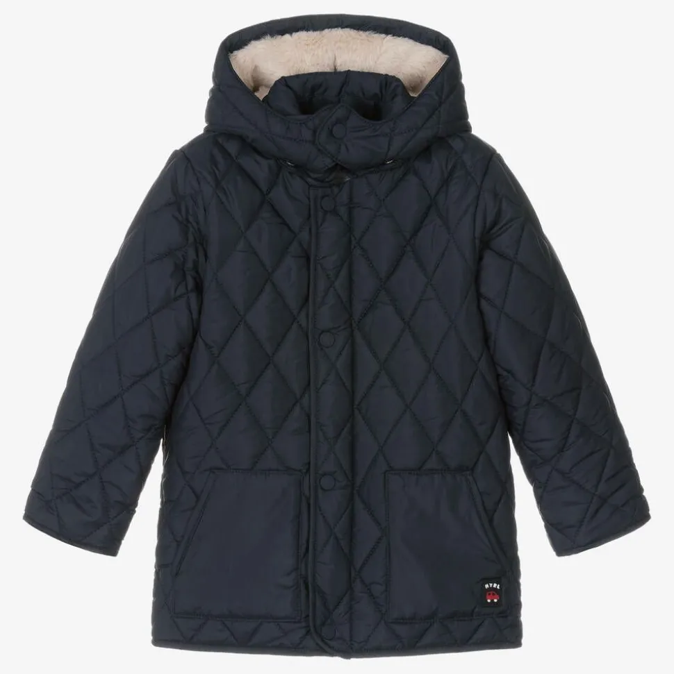 Navy blue quilted coat for little boys by Mayoral, lined in soft plush faux fur for warmth. It has a detachable, popper fastening hood, useful for switching up your toddler's look. One of the hand pockets has a cute red car logo motif, and it easily fastens with a zip and poppers on the front.