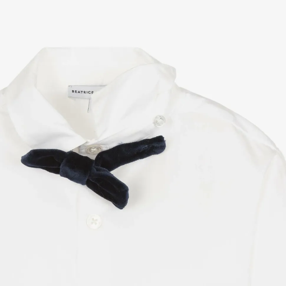 Navy blue waistcoat suit and bow tie set for boys in luxurious velvet by British brand Beatrice & George, exclusive to Childrensalon. Ideal for a special occasion, the smart white poplin shirt has branded button fastenings on the front and cuffs, and comes with a detachable, button-fastening, velvet bow tie. The waistcoat has a velvet front and a beautiful satin jacquard back, patterned with the designer's monogram logo for a stylish touch. The coordinating velvet trousers have a matching satin lining and a useful, adjustable waist for a good fit. On the front there are slanted pockets with a button and zip fastening, whilst there are faux pockets on the back.