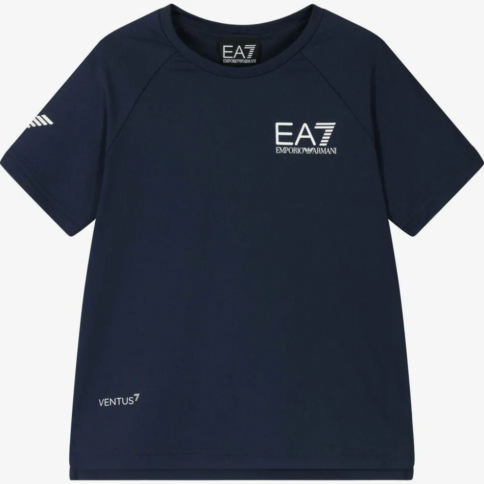 Ideal for sports, this navy blue short-sleeved T-shirt for boys is by Italian brand EA7 Emporio Armani. Made in super lightweight Ventus7 fabric, it is breathable with anti-abrasion seams for durable wear. There is a white EA7 logo print on the chest and an Eagle logo stamped on one sleeve for a designer look.