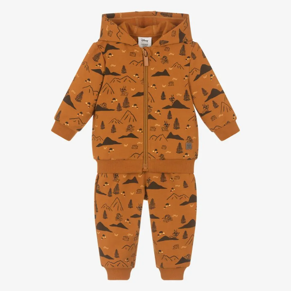 A brown-orange tracksuit for boys by French brand Carrément Beau, with a cute all-over print of Disney's Thumper rabbit. Casual and comfortable, it is made in soft organic cotton jersey with a cosy fleece inside. The zip-up top is hooded and the joggers have a gently elasticated waistband.