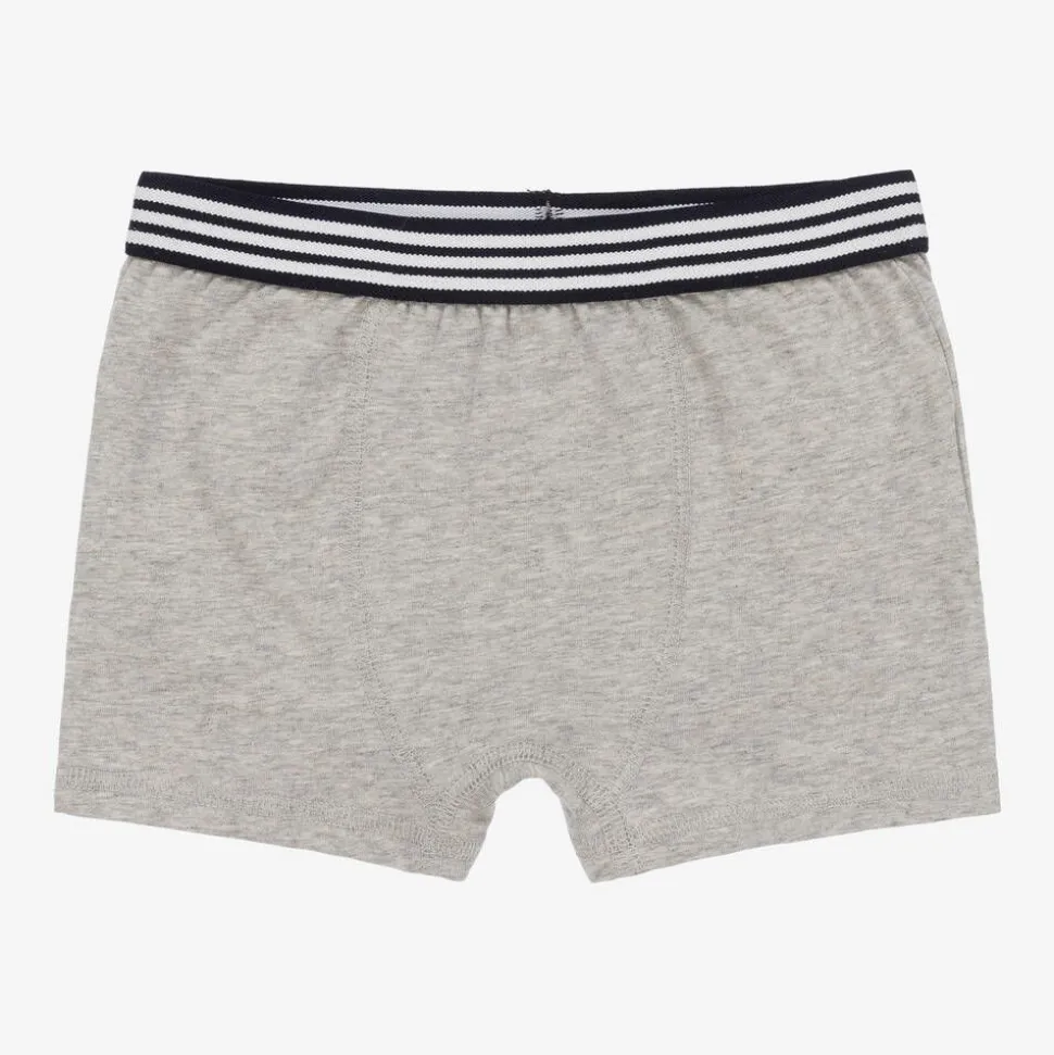 Pack of three organic cotton boxer briefs for boys by British brand Childrensalon Essentials, in white, black and grey marl. Soft and comfortable, they are made in stretchy jersey with black and white striped elasticated waistbands.