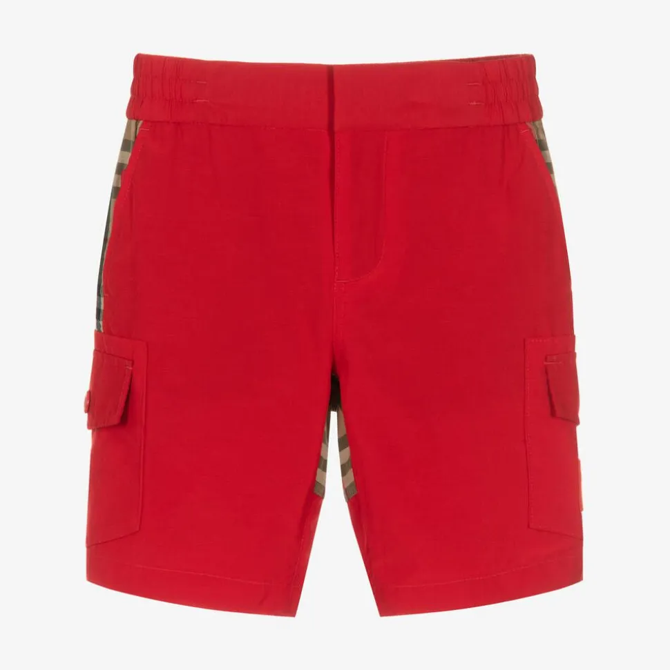 Stylish red cargo shorts for boys by luxury British brand Burberry, made in a silky cotton blend. For instant recognition, they are trimmed with the designer's distinctive Archive beige Vintage check across the back. Comfortable and practical, they have an elasticated waist with zip and hook fastening, slanted front pockets and a back welt pocket. To complete the look, there are patch pockets with branded popper flaps and a rubberised Horseferry logo on one side.