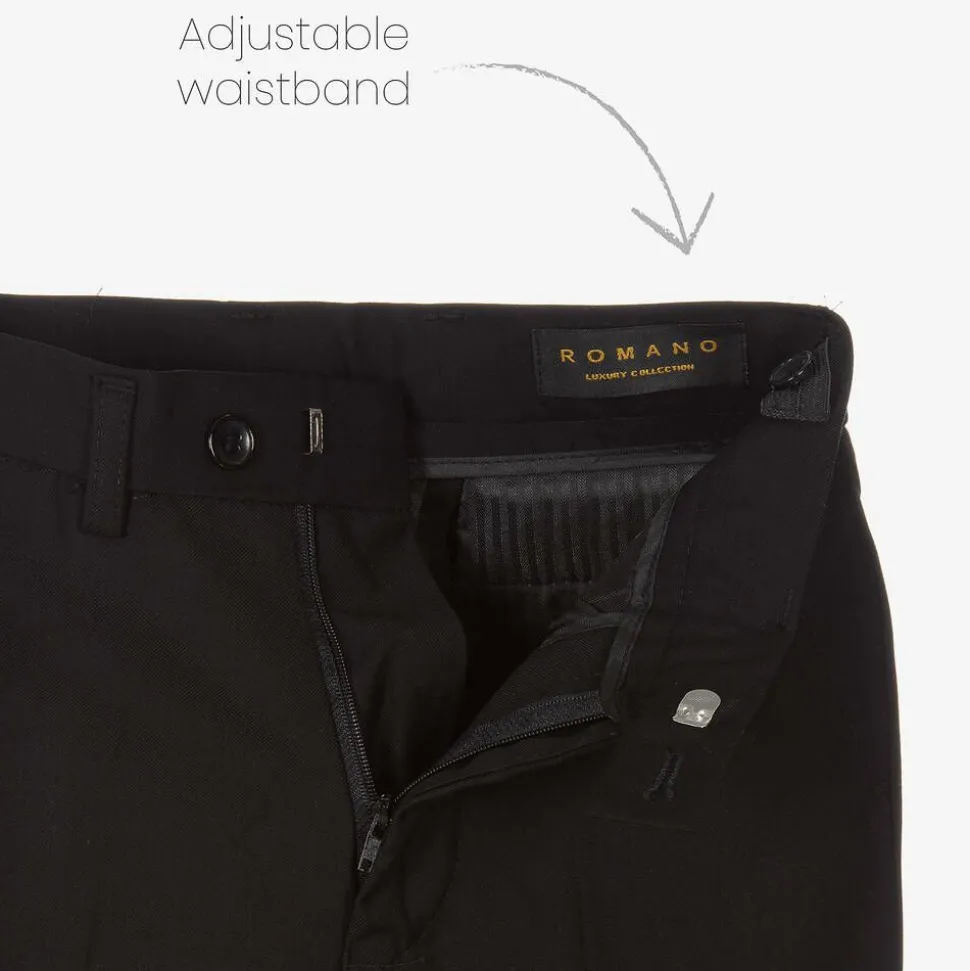 From the luxury collection, a smart red and black suit for boys by Romano, hand-tailored in a silky paisley jacquard. Great for special occasions, the single-breasted tuxedo jacket has a black satin shawl lapel with a matching button fastening and jetted pocket trims. The classic white shirt has front button fastenings, a curved hem, and a pointed collar. A pair of black twill trousers with an adjustable waist complete the coordinated look.
