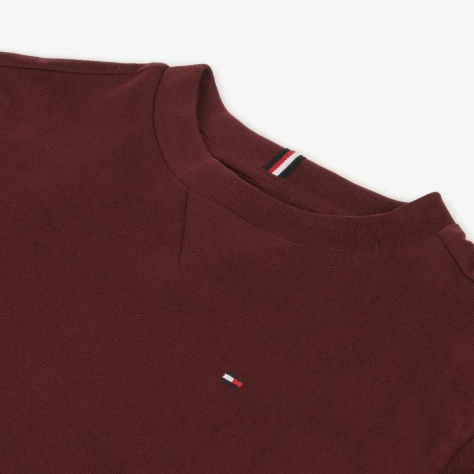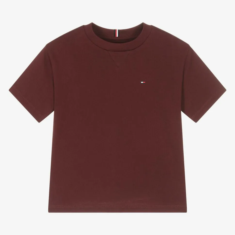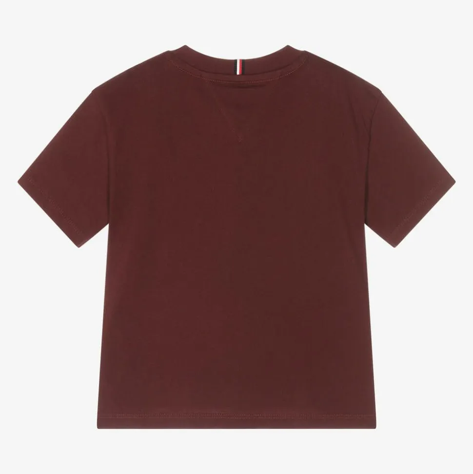 Burgundy red cotton short-sleeved T-shirt for boys by American brand Tommy Hilfiger, with the label's signature flag logo embroidered on the front in red, white and blue. Made in soft, comfortable jersey, the T-shirt has more branding on the back of the crew neck, and a 'V' panel on the front, allowing extra stretch when putting it on.