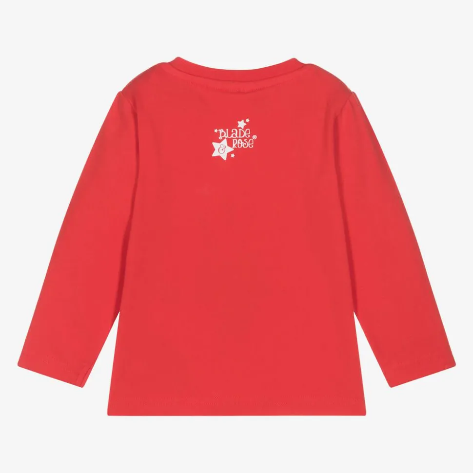 Eye-catching red cotton top for little boys from Blade and Rose. This soft, long-sleeved jersey top has a fun pirate face on the front. For ease of dressing, it has popper fastenings on one shoulder.