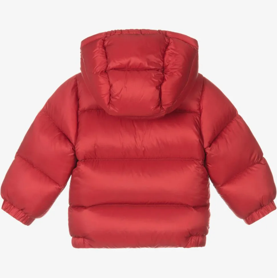Red hooded puffer jacket for little boys by luxury brand Moncler Enfant, with the iconic logo patch on the sleeve. Made and lined in the brand's super lightweight and water-repellent nylon doudoune legere, it is down padded for excellent warmth. Easy to zip up on the front, it also features elasticated cuffs to keep the chills out, a silky navy blue lining and popper fastening front pockets.