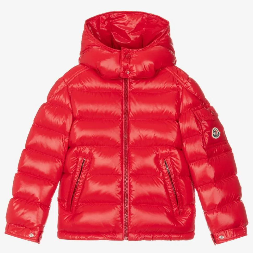 Red with a shiny finish, this stylish puffer jacket for boys is by luxury brand Moncler Enfant. The designer's iconic felted logo badge is displayed on the sleeve pocket for a signature look. Silky smooth and water repellent, the jacket is padded with soft down for superior warmth, and has elasticated adjustable cuffs to help keep out chilly winds. There is a detachable hood, an exposed front zip fastening, and zipped front pockets.