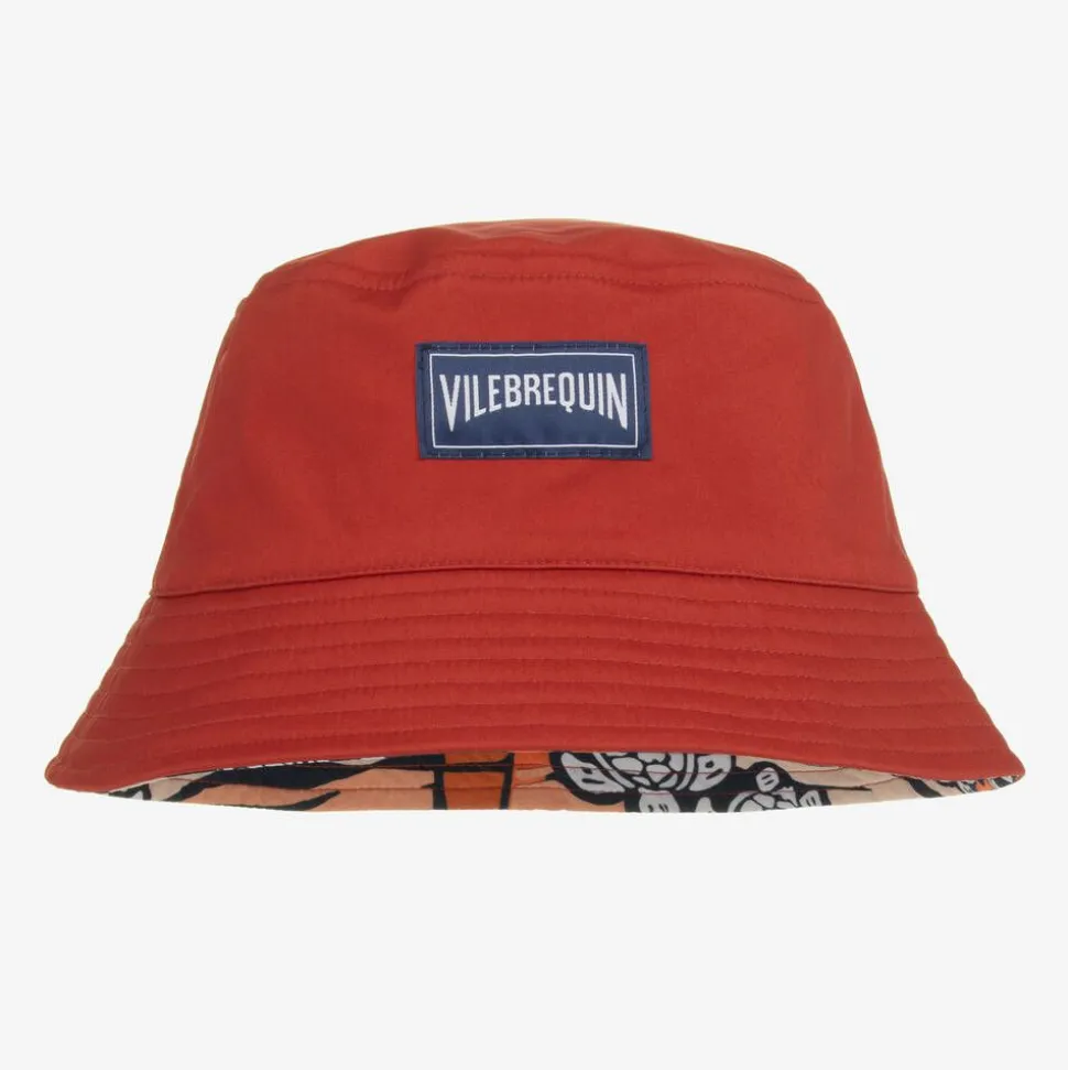 In shades of red and orange, this reversible bucket hat for boys is by Vilebrequin. Made using recycled material, one side is patterned in the brand's vibrant Monoi Turtles print, whilst the other side is plain brick red. For designer appeal, both sides are trimmed with a branded tab.