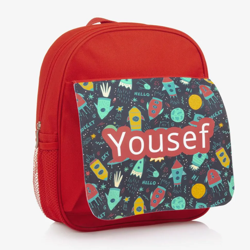Red canvas backpack for boys by Treat Republic, featuring a detachable, personalised flap-over front, with a cool rocket design. Great for school or fun days out, this practical bag has a spacious, zip-fastening main compartment and a slip pocket on the front. There are further pockets on each side, one fastens with velcro and the other is mesh, making it ideal for bottles. It has adjustable shoulder straps, a padded back and a useful top handle for hanging on a hook.
