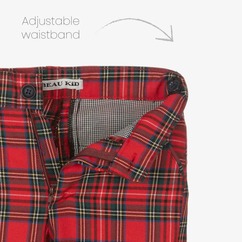 Smart red tartan check shorts suit for boys by Beau KiD, made in a soft viscose blend twill. With a silky navy blue lining, the jacket has a navy blue checkerboard lapel pin and a removable white pocket square for style. The coordinating shorts have a useful adjustable waistband and come with a detachable navy blue woven belt. They have slanted front pockets and faux back pockets. The white shirt is made in a silky cotton blend with a fine diamond jacquard texture and a button-down collar. An adjustable bow tie in matching tartan check completes the set.