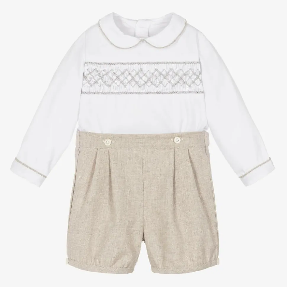 A traditional shorts set for little boys, handmade in soft cotton by Kidiwi. Pleated on the front, the beige shorts are gently elasticated at the back and fully lined for comfort. The white twill shirt has a sweet rounded collar, classic hand smocking across the chest, and coordinating piped trims. The two pieces button together for a neat and tidy finish.