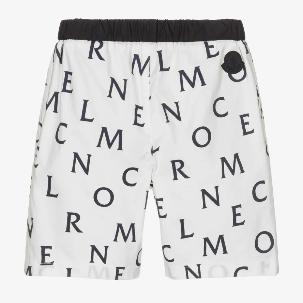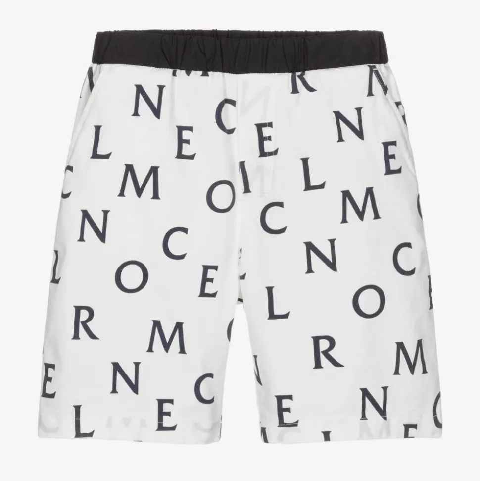 Boys off-white casual shorts by luxury brand Moncler Enfant, made in soft cotton with stretch. They have an all over navy blue logo lettering pattern with a navy blue rubber logo on the back. The elasticated waistband is covered in navy blue silky nylon and there are slanted pockets on the front.