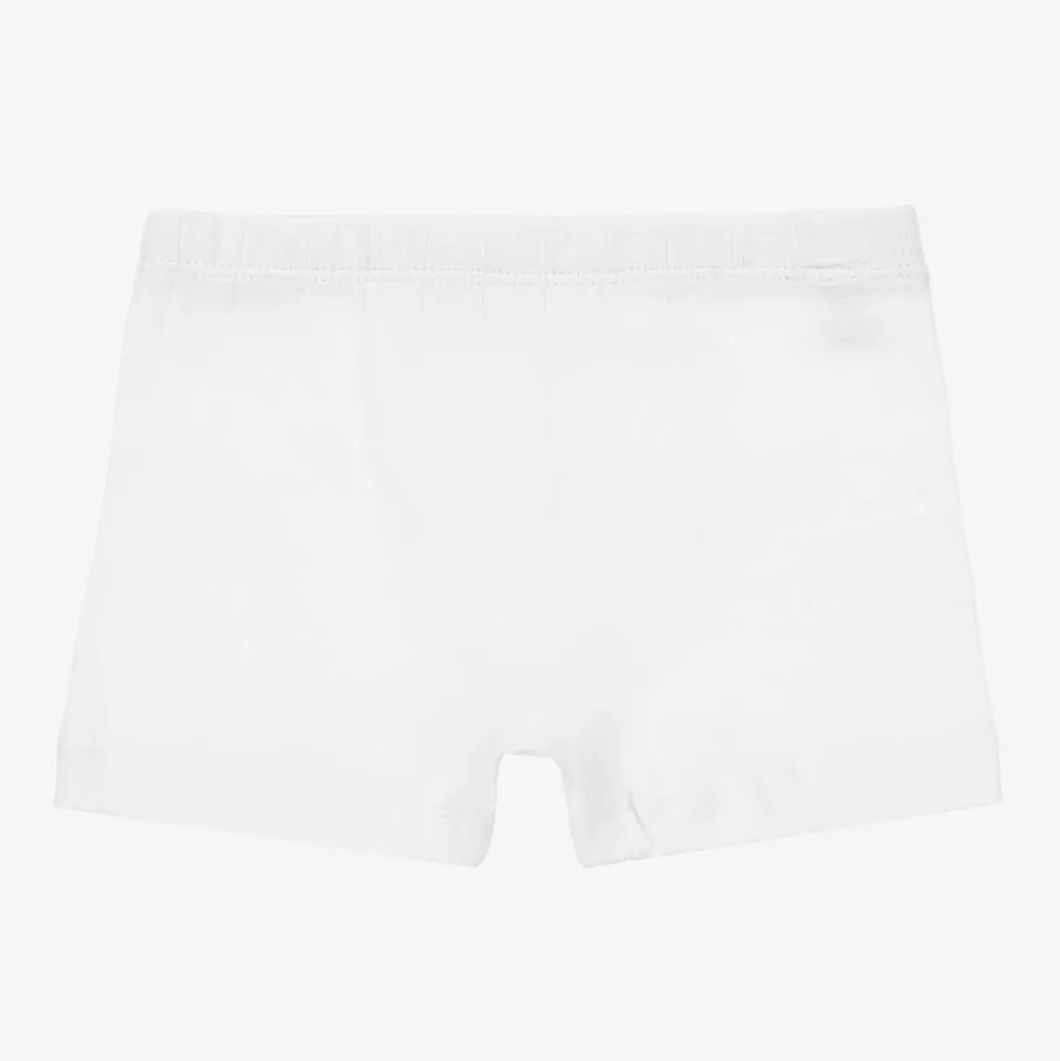 Simple white boxer shorts for boys by Diacar. Comfortable to wear, they are made from soft cotton jersey with a subtle pinstripe pattern and have a stretchy elasticated waist.