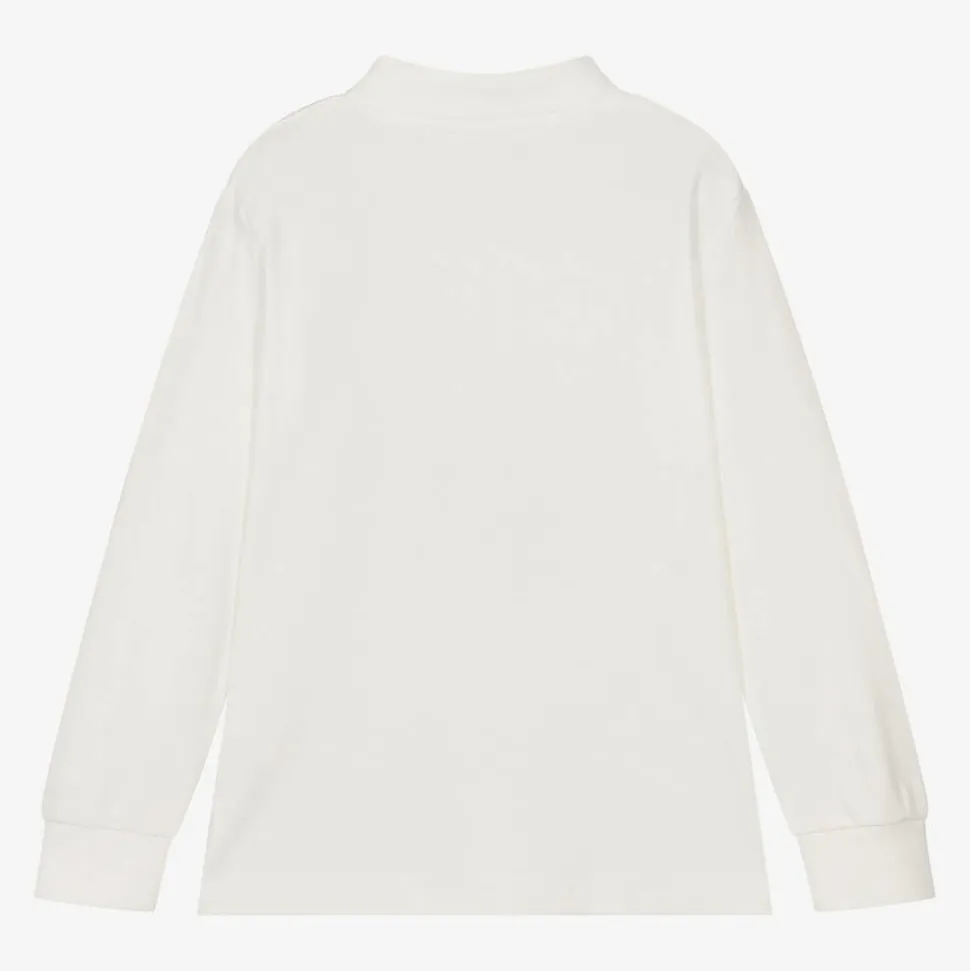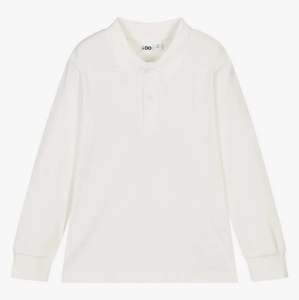 Casual white rugby shirt for boys by Italian brand iDO Baby, made in soft cotton jersey. This wardrobe staple has ribbed cuffs on the long sleeves and a hemline that is longer around the back than the front. A tonal slogan on the chest and branded button fastenings on the front add a subtle designer finish.