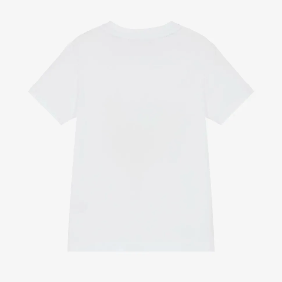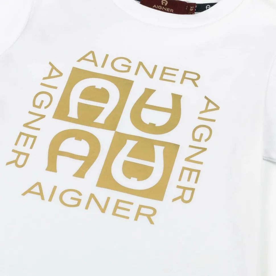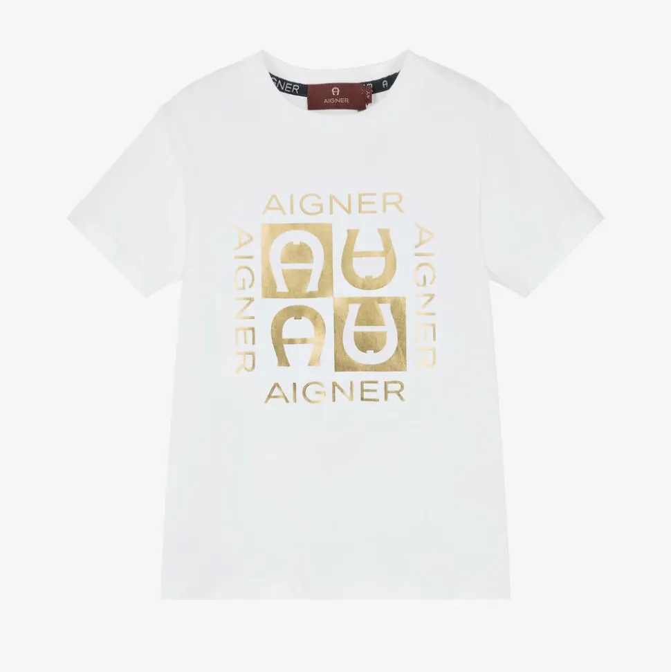White T-shirt for boys by AIGNER, with a shiny gold logo featuring the signature 'A' horseshoe motif. This comfortable short-sleeved style is made in soft cotton jersey.