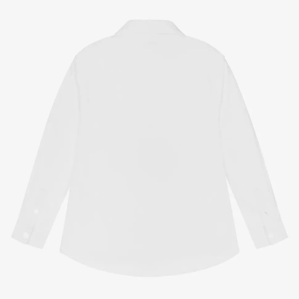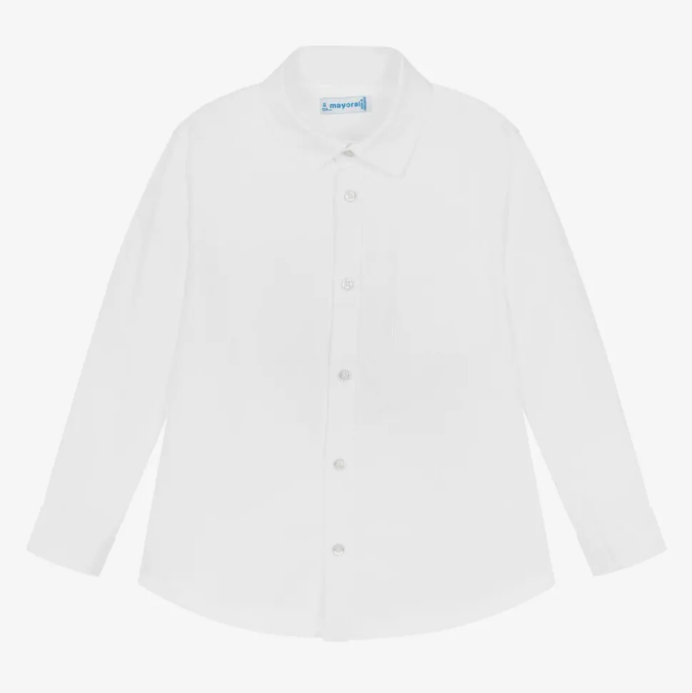 A white shirt for boys by Mayoral, woven in soft and lightweight cotton twill. Suitable for smart-casual wear, it has long sleeves and a pointed collar. It fastens with branded button fastenings on the front and cuffs, and has a chest pocket.