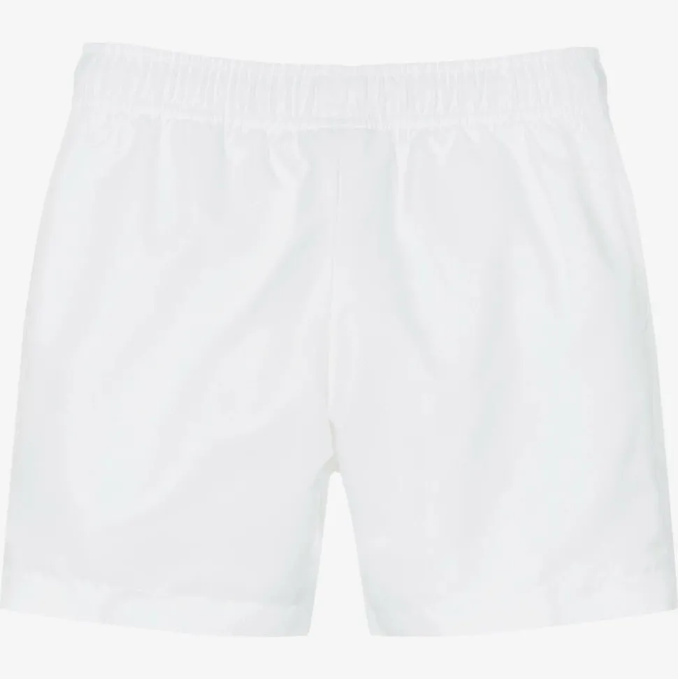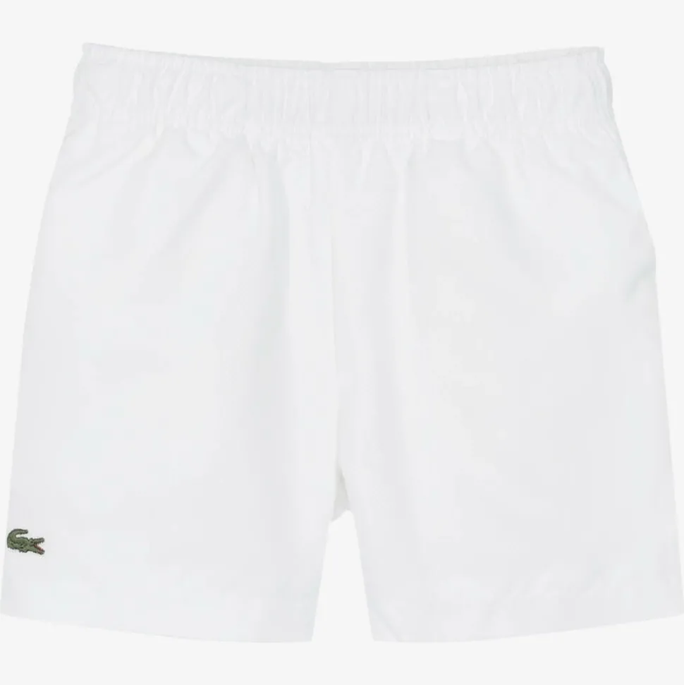 White sports shorts for boys by Lacoste, with the brand's iconic crocodile logo appliquéd on one leg. Using recycled materials, the external fabric is made in a technical diamond weave taffeta that is light weight, quick drying, and crease-proof. Lined in soft jersey, they have useful side pockets and an elasticated waistband with an internal drawstring for comfort.