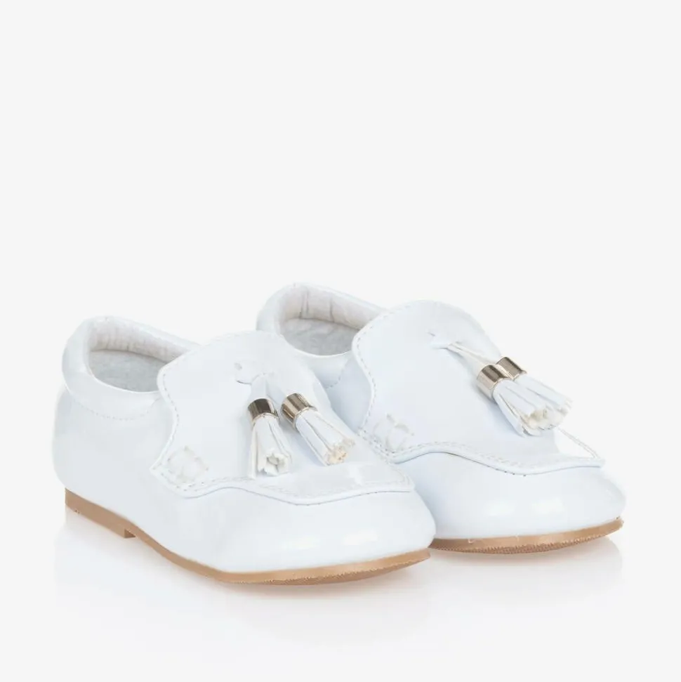 Smart white loafers for little boys by Sevva, ideal for a special occasion. They are made in glossy faux patent leather, with quintessential tassel trims. Lined in smooth faux leather, they are elasticated over the foot for easy slip on. The insoles are softly padded for comfort and the rubber soles are textured for good grip.