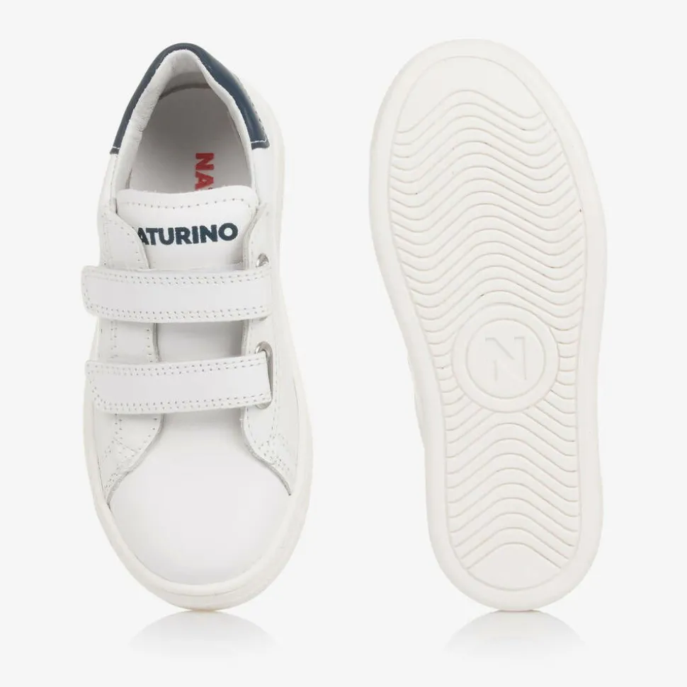 White trainers for boys by Naturino, made in smooth leather with a perforated side panel. Fastening with velcro straps, this casual style has a navy blue heel panel with a coordinating blue logo stamped on the tongue. They are lined in soft leather, with a cushioned insole ensuring comfort and a flexible, non-slip rubber outer sole providing good grip.