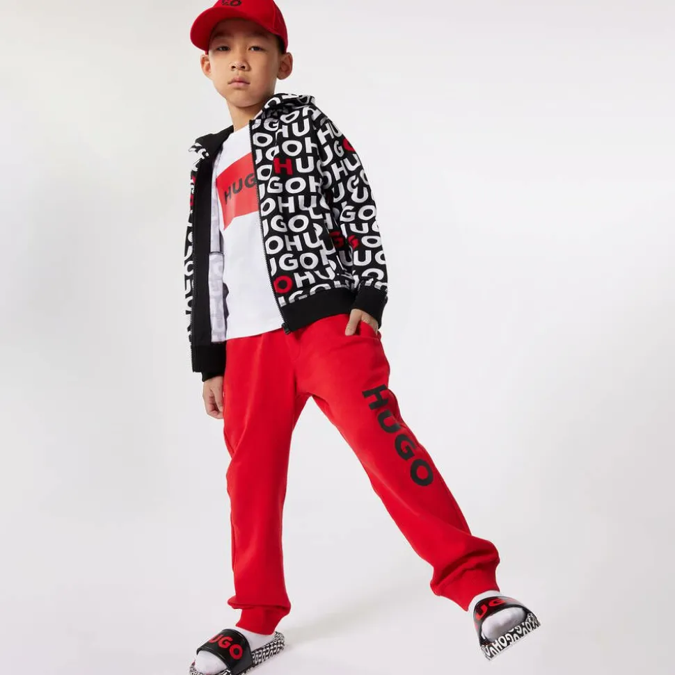 White short-sleeved T-shirt for boys by HUGO, made in soft organic cotton jersey. Cool and casual, this crew neck top has a bold, red box logo graphic on the front for a branded look.