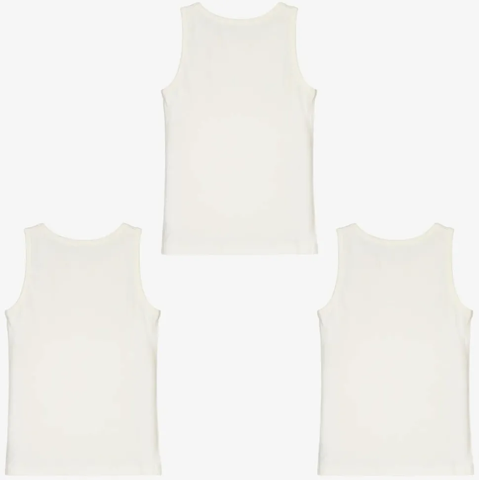 A pack of three vests for boys by Childrensalon Essentials, made with ultra-soft, stretchy organic cotton jersey. Ideal as wardrobe staples, they are off-white. The set is presented in fully biodegradable packaging.