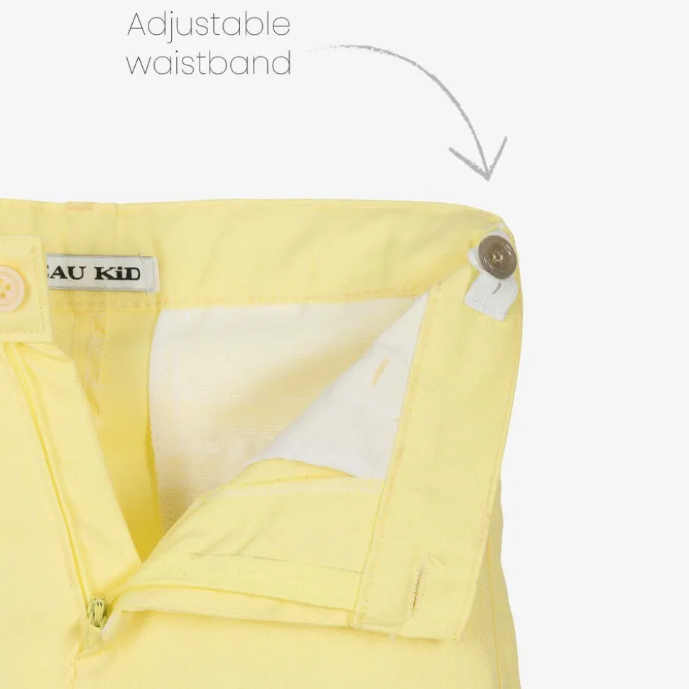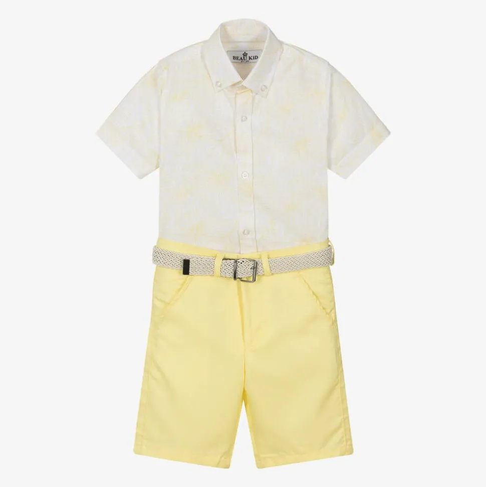 White and yellow shorts set for boys by Beau KiD, made in a soft cotton blend. Lightweight with a textured weave, the short-sleeved shirt has a subtle yellow floral pattern, a stylish button-down collar. It pairs with soft and lightweight yellow twill Bermuda shorts. Styled with slanted front pockets and buttoned back pockets, they fasten with a zip and a button and have an adjustable waist for a comfortable fit. A braided ivory belt completes the look.