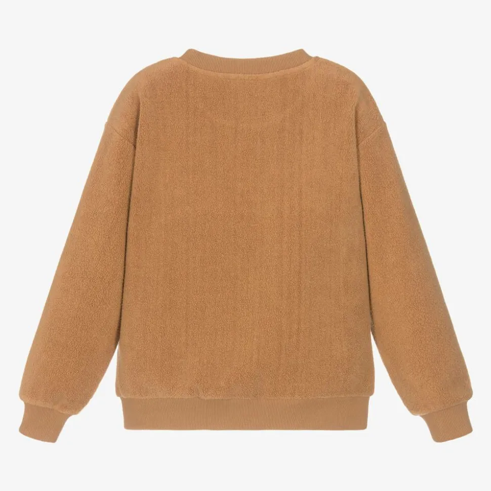 Cosy tan brown fleece sweatshirt for boys and girls by luxury Italian designer Moschino Kid-Teen. For instant brand recognition, the signature Moschino Teddy Bear and logo are embroidered on one side. In a relaxed, drop-shouldered style, it is made in a comfortable cotton and modal blend jersey, with neat, ribbed trims.
