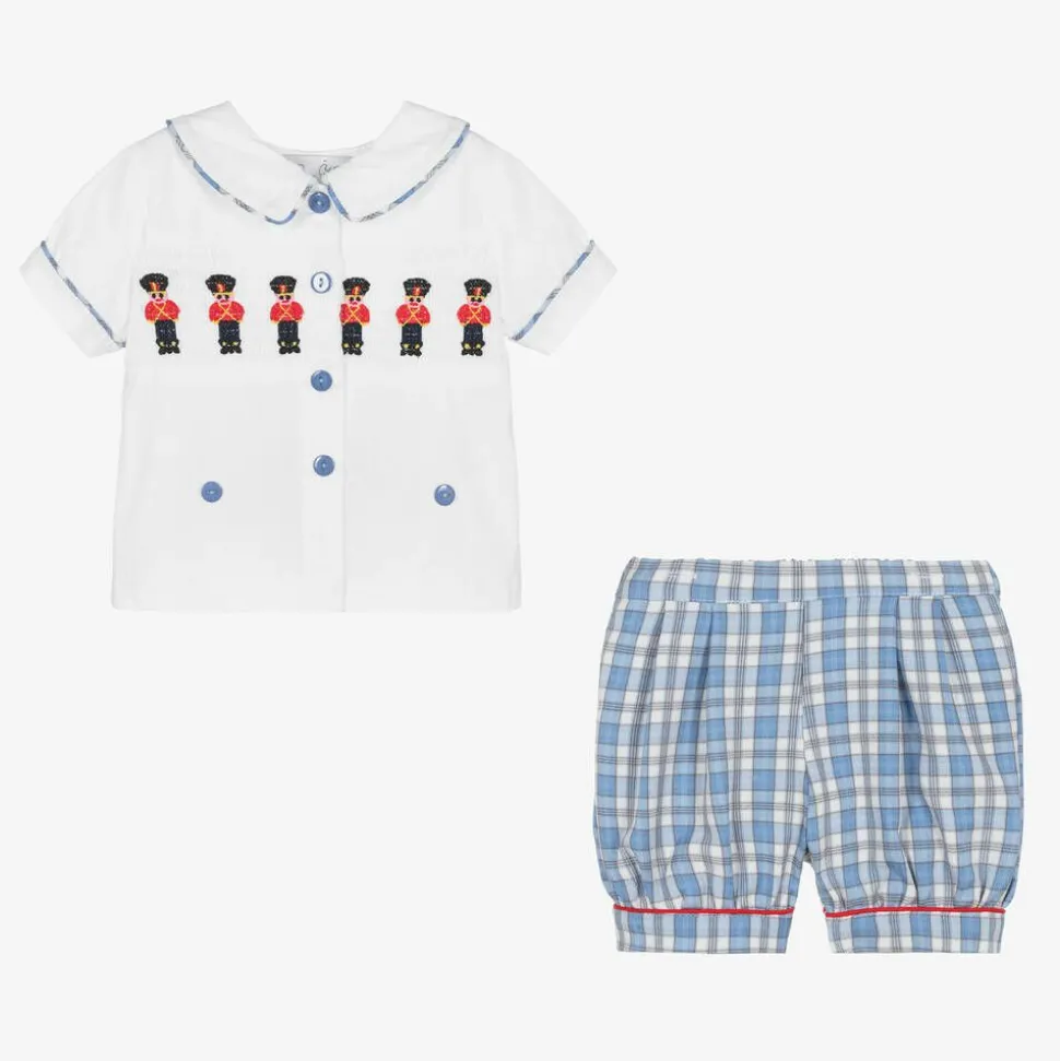 Blue and white buster suit and hat set for baby boys by Beau KiD, made in soft, lightweight cotton. The white shirt has blue checked trims and buttons. It is smocked on the chest, with embroidered red and black soldiers. The blue and white checked shorts have red trims and fasten to the shirt with buttons. A matching hat completes the set.