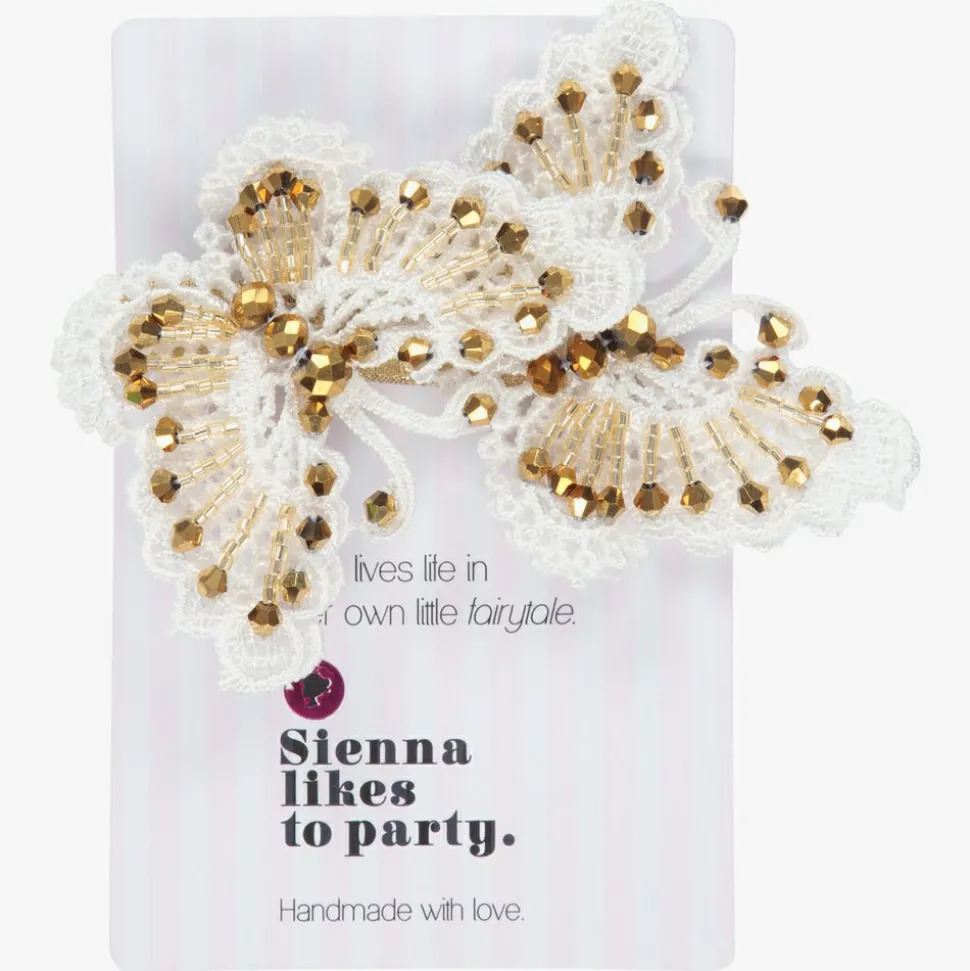 Beaded butterfly hair clip for girls by Sienna likes to party. Made in white macramé, with gold crystal beads, this pretty hair accessory has two butterflies and secures to the head with a fabric covered metal crocodile clip.