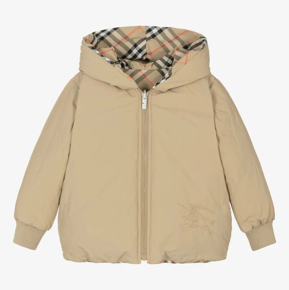 A reversible beige jacket for girls by luxury designer Burberry, embroidered with the symbolic Equestrian Knight Design on both sides. Great for creating many different looks, this hooded style switches from the statement Burberry Check to a solid beige colourway. It has a silky smooth feel and is padded with luxurious down for warmth without the weight. Other features include a signature B-cut zip pull, ribbed knit cuffs and a gently elasticated hem for added comfort. Seam pockets fasten securely with poppers.
