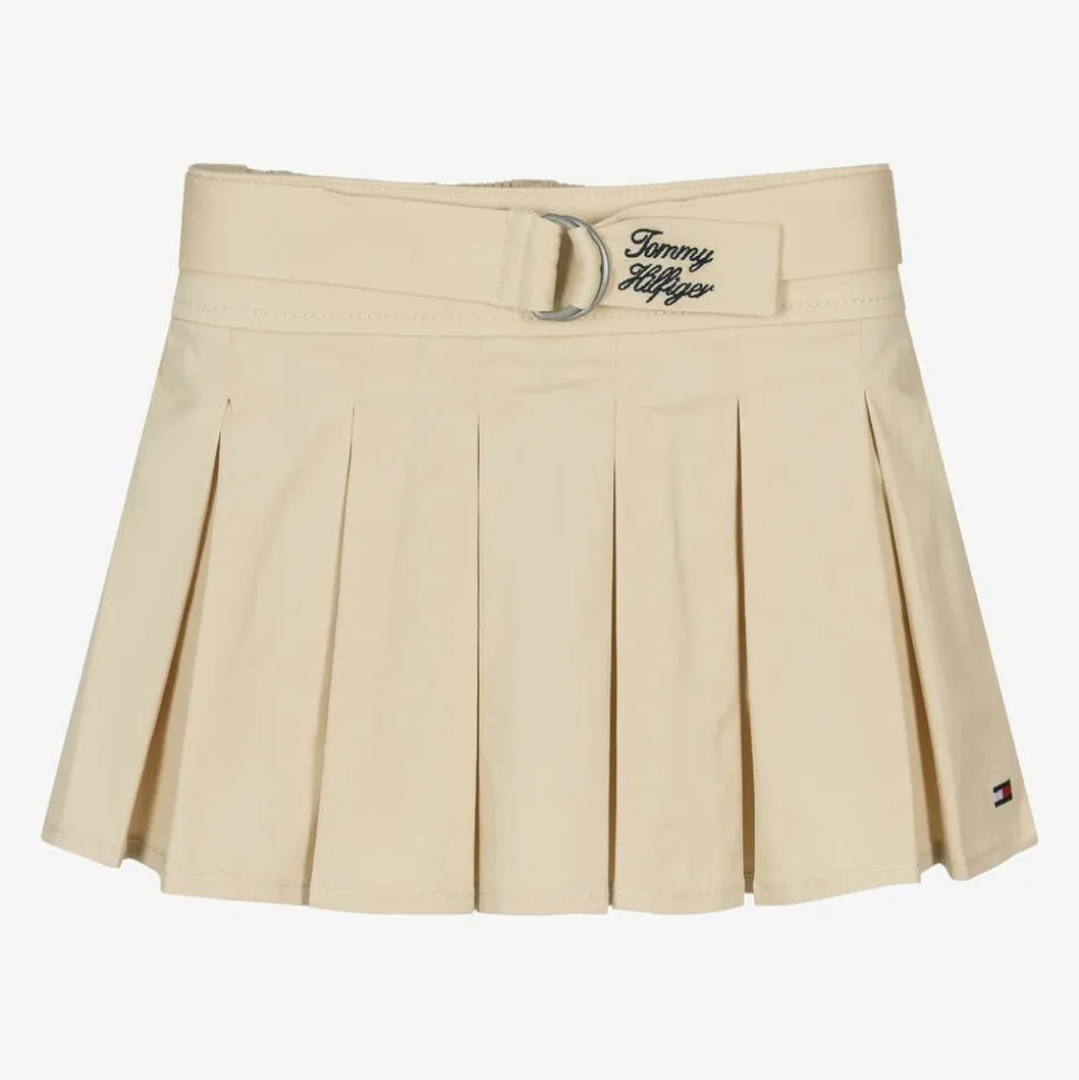 Beige pleated skirt for girls by Tommy Hilfiger, made in soft cotton twill. Designed with a partially elasticated waistband, this comfortable skirt comes with a matching belt, embroidered with a signature navy blue logo for a distinctive look. Adding an extra designer detail, the iconic flag logo is embroidered just above the hem.