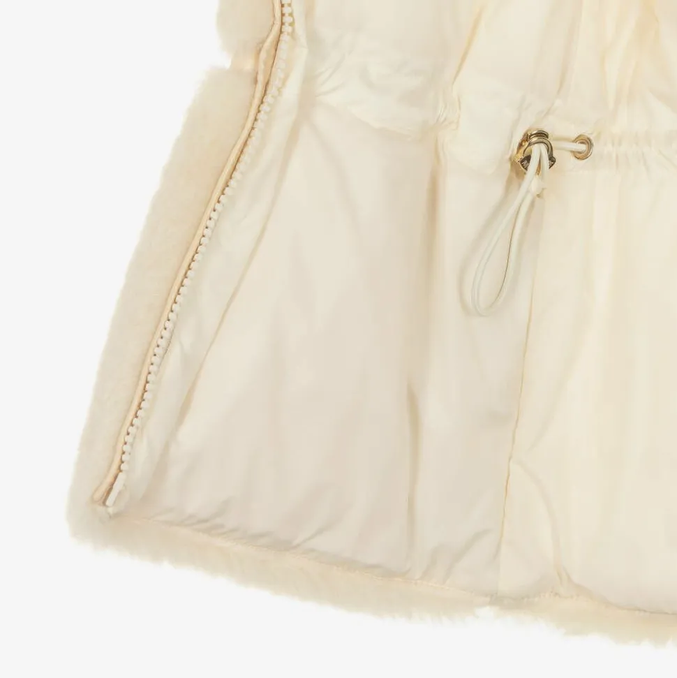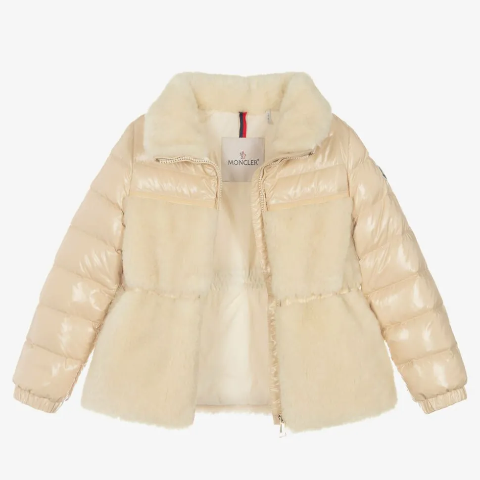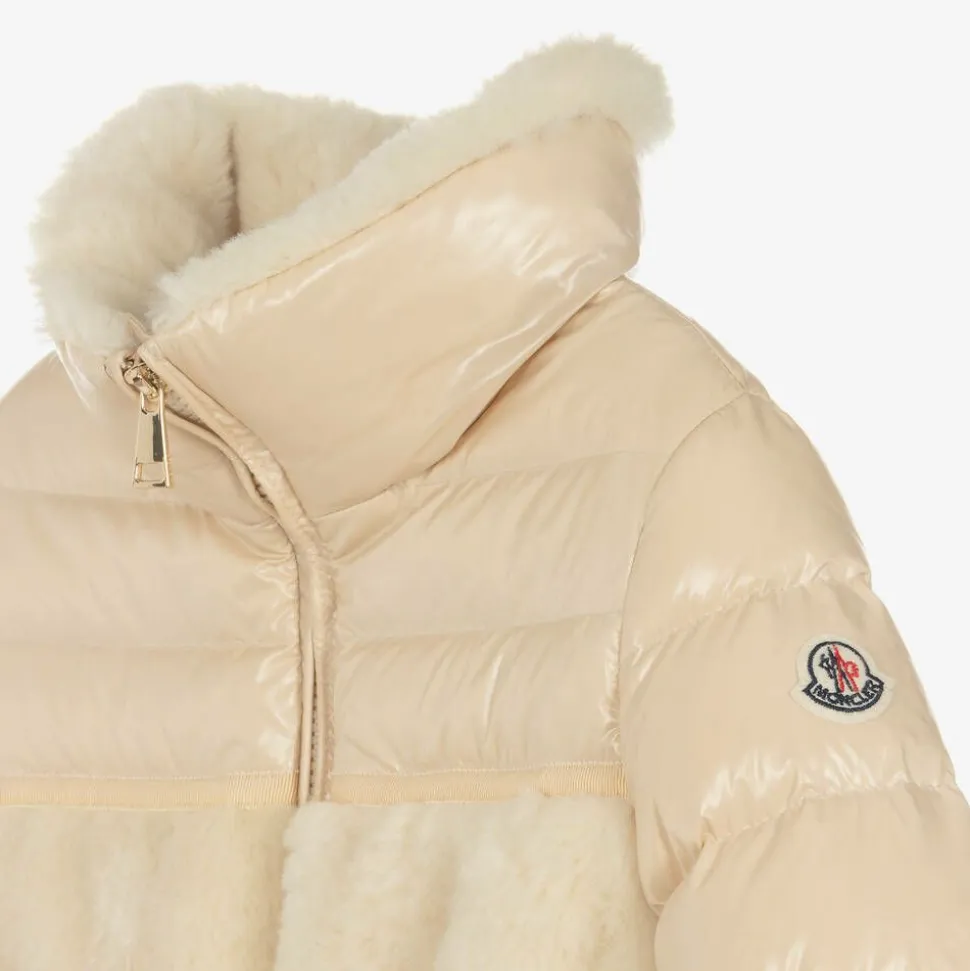 Stylish beige jacket for girls by luxury Italian designer, Moncler Enfant. Padded with warm down for a cosy fit, this outerwear piece has snuggly sherpa fleece on the front and back and an elasticated waist for shape. Styled against the high-gloss fabric for a contemporary look, it fastens with a shiny gold zip on the front and has popper-fastening front pockets. The elasticated cuffs help to keep out cold chills, and the silky lining ensures a comfortable fit. The iconic felt logo badge is appliquéd on one sleeve for a branded touch.