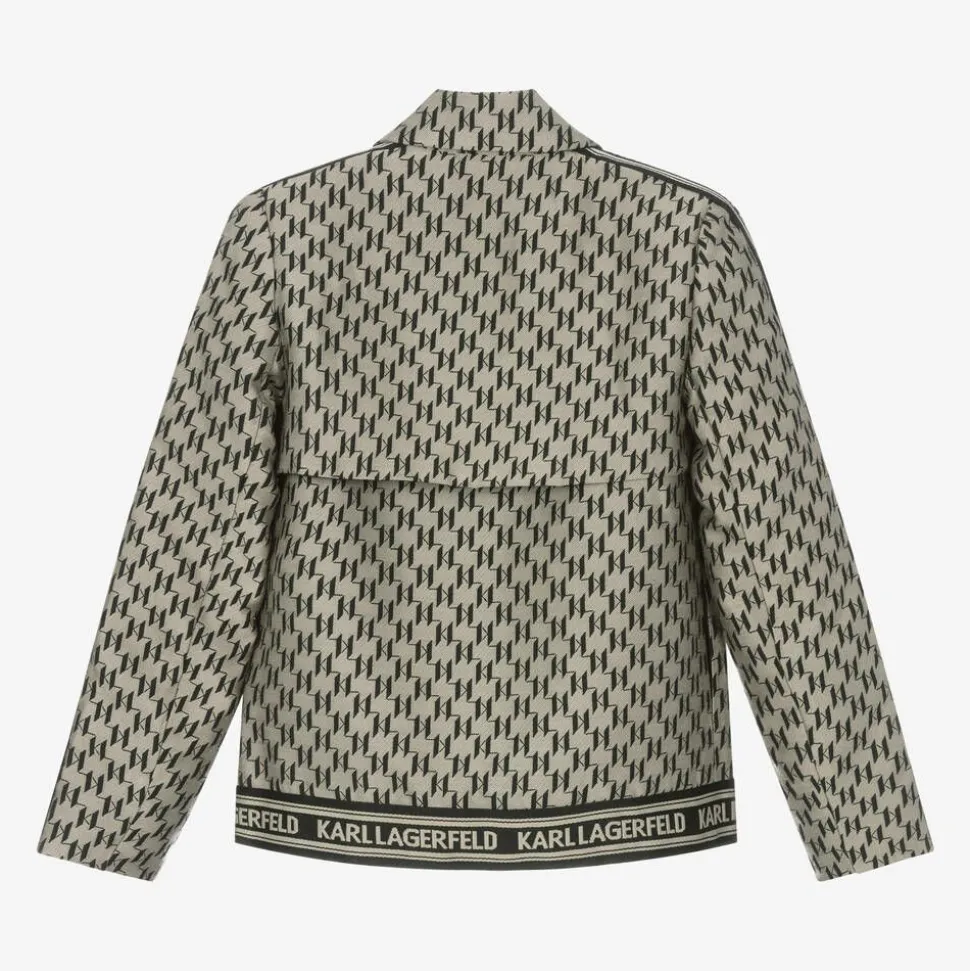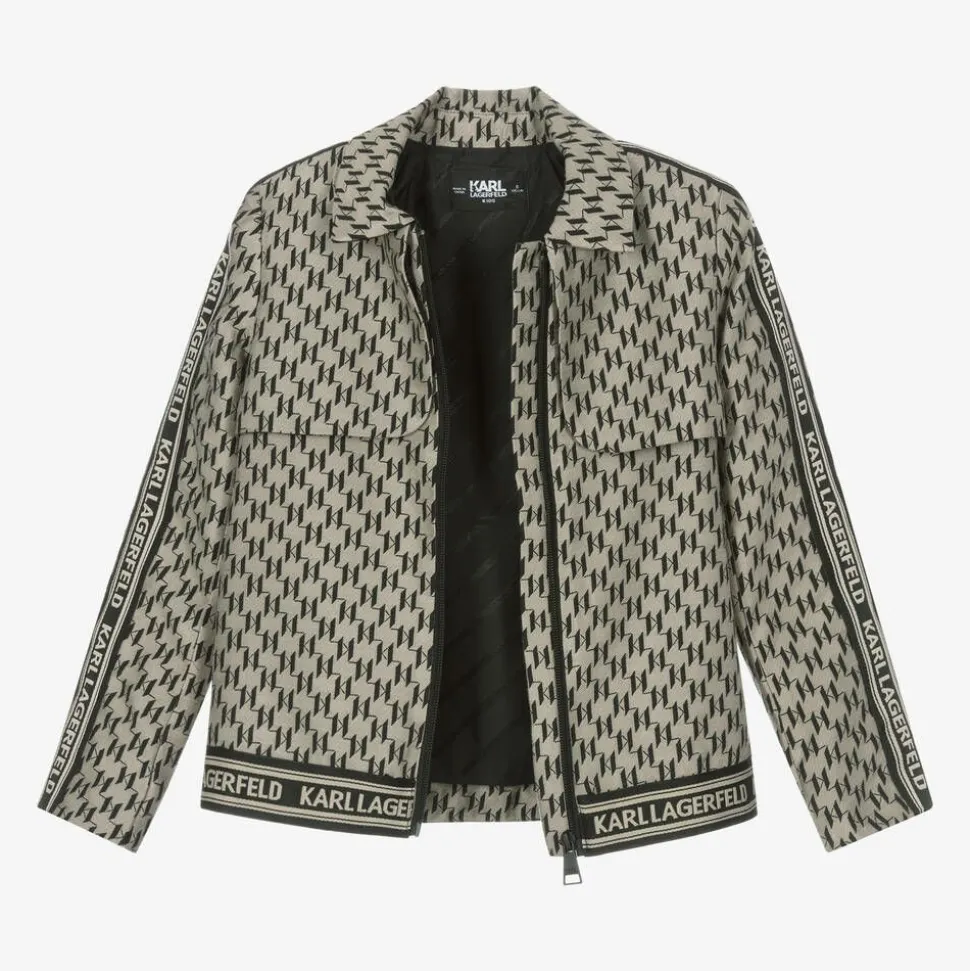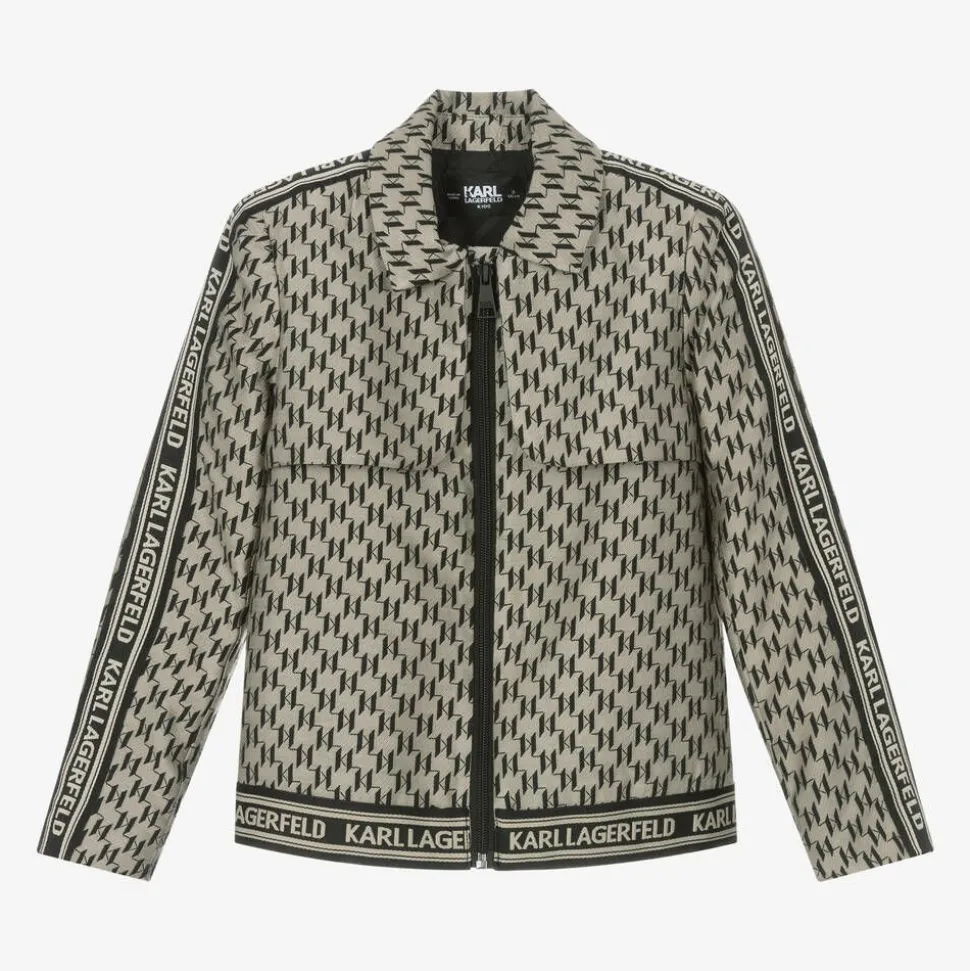 Cool beige jacket for girls by KARL LAGERFELD KIDS, patterned with the brand's KL monogram in black. Made in soft twill, it has stylish panels overlaid on the front and back, with jacquard logo taping along the sleeves and waistband. It is lined in jacquard logo satin for comfort and fastens with an exposed, black zip on the front.